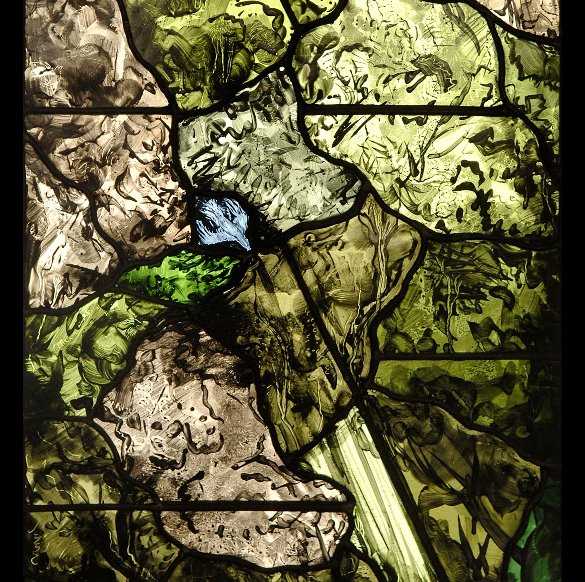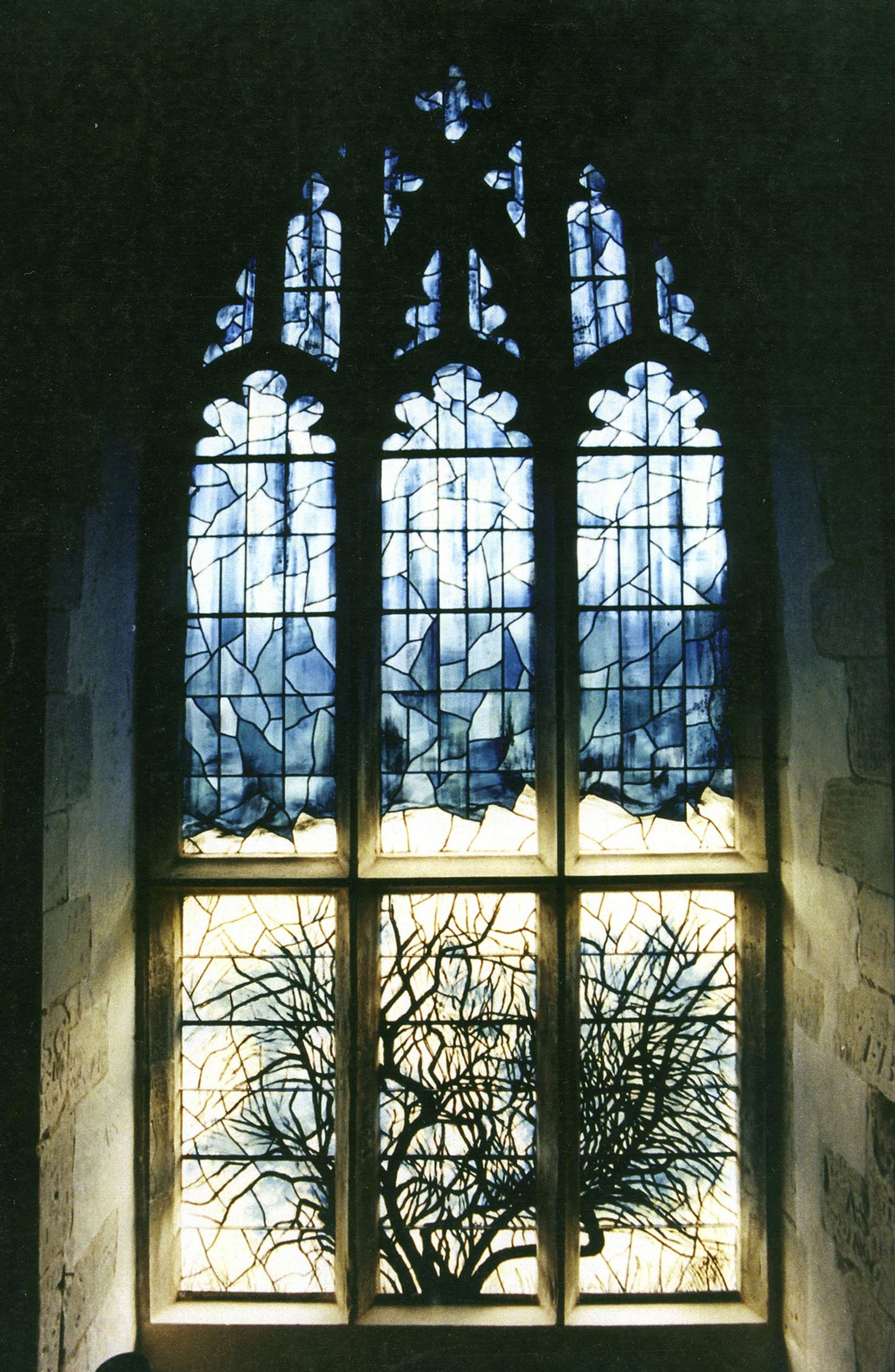 Patrick Reyntiens (designer and glass painter), John Reyntiens (glass maker), Tree of Life (stained glass), St Andrew, Much Hadham, Hertfordshire, 1994-95. The lower section of the window makes use of an etching provided for the purpose by Henry Moore, Trees V: Spreading branches (1979), before his death in 1986 Courtesy of Reyntiens Trust