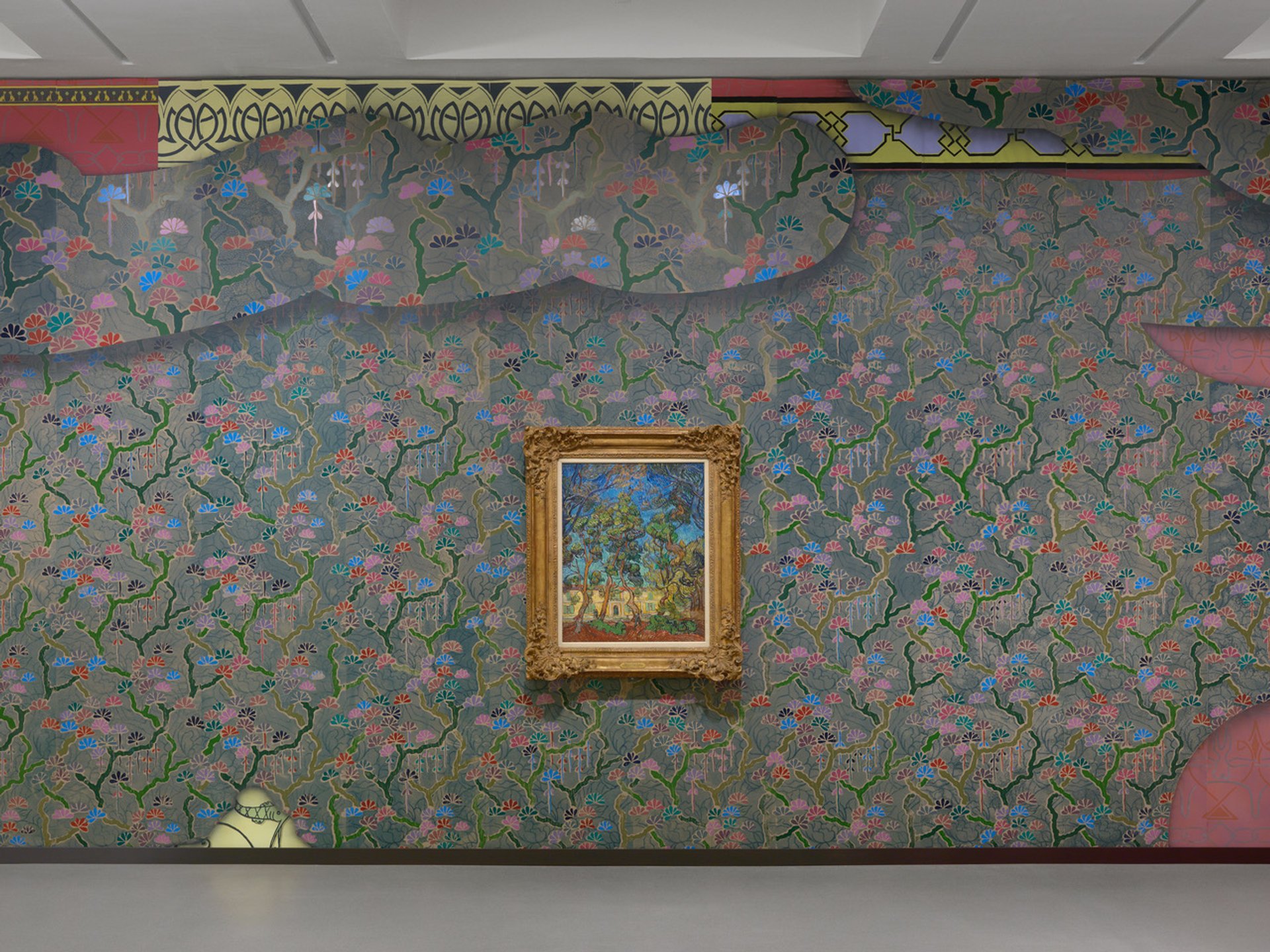 Laura Owens’s 2021 installation at the Fondation Vincent van Gogh Arles, including Van Gogh’s original painting Hospital at Saint-Rémy (October 1889), on loan from the Hammer Museum, Los Angeles Courtesy of the artist and Sadie Coles Hq, London (photo: Annick Wetter)