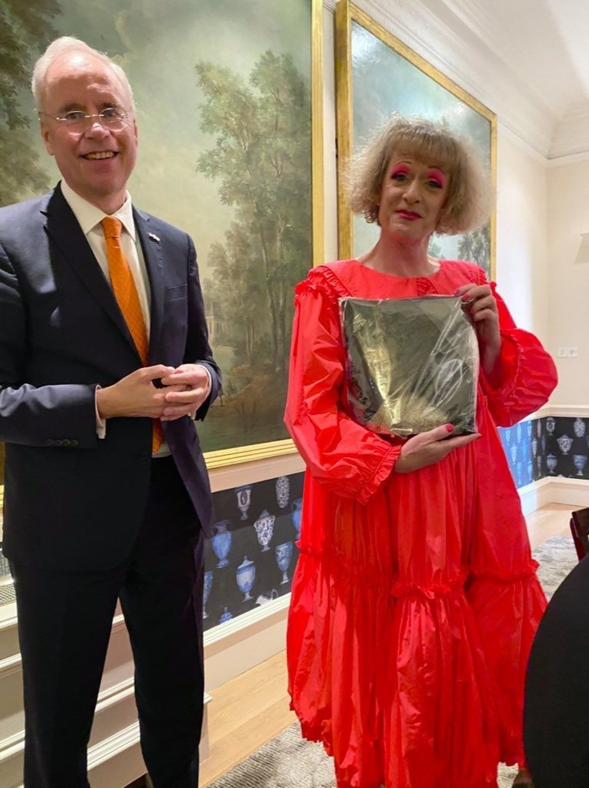 Grayson Perry accepting a gift from Dutch ambassador Karel J.G van Ooosterom
