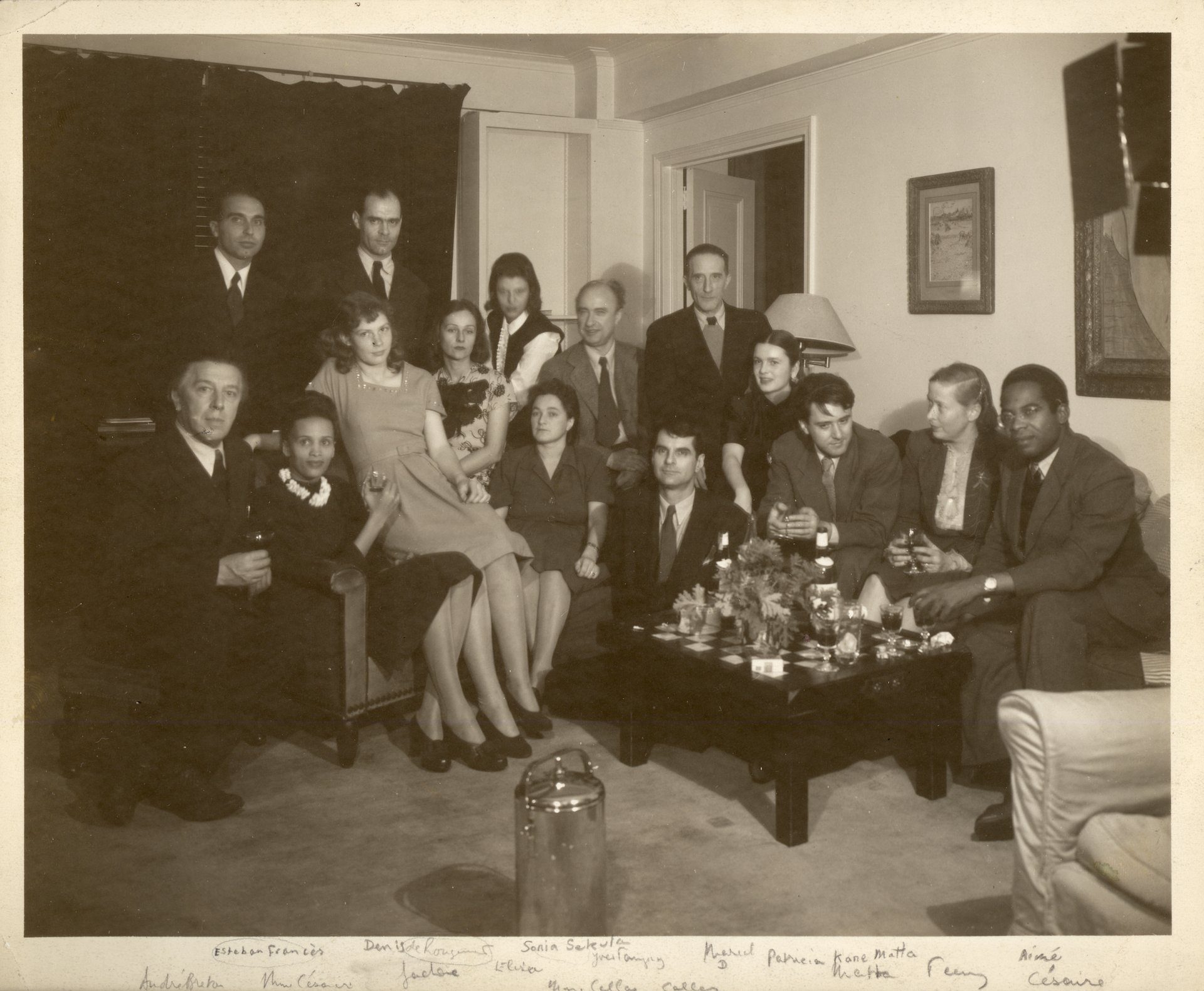 André Breton, Esteban Frances, Suzanne Césaire, Jacqueline Matisse-Monnier, Denis de Rougemont, Élisa Breton, Sonia Sekula, Madame Nicolas Calas, Yves Tanguy, Nicolas Calas, Marcel Duchamp, Patricia Kane Matta, Matta, Alexina "Teeny" Matisse and Aimé Césaire, New York, November 20, 1945. Courtesy Duchamp Research Portal