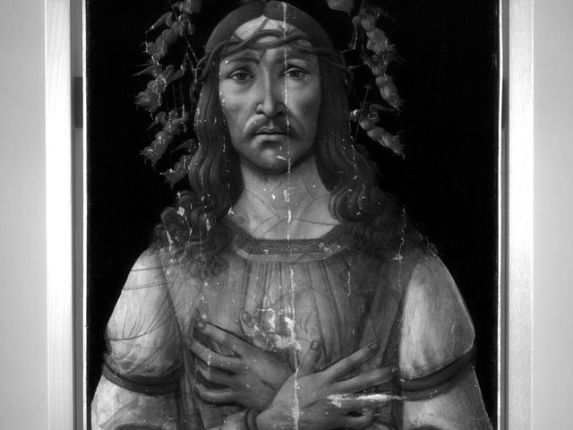 The uniqueness and “pictorial intelligence” of the iconographic invention—a feature unparalleled in Italian art—also speak in favour of the work’s attribution to Botticelli. The painter shows Christ as a strictly frontal half-length figure, yet he has subtly circumvented the symmetry, using a turn of the neck to shift the head toward the left. The eyes also evade precise conformity to the symmetrical design of the face. By placing the fingers of his left hand in a slit in the crimson fabric, which corresponds to the thrust of the lance, Christ calls attention to the wound, although it is actually concealed beneath his robe.