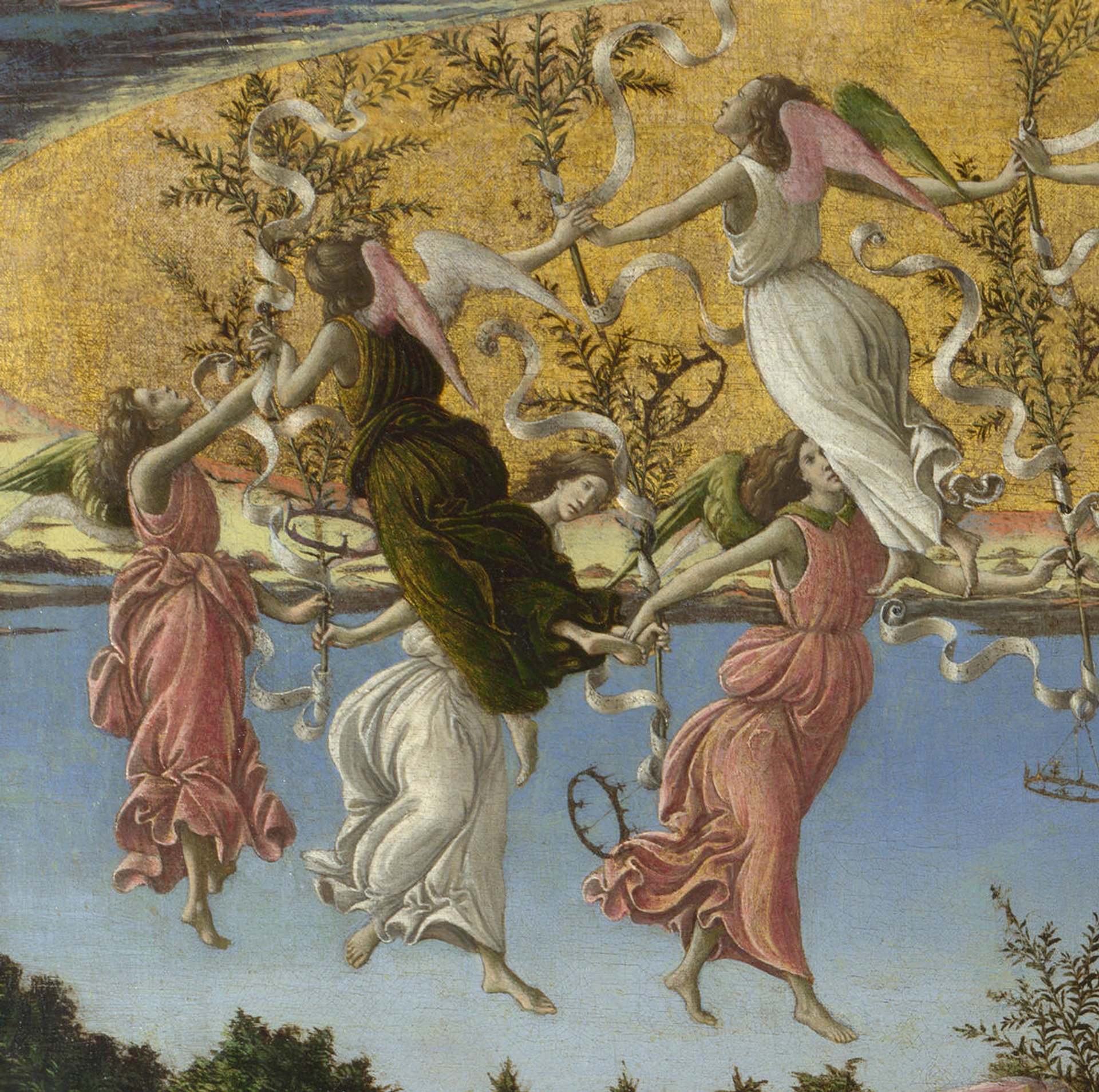 Above all, however, we must direct our attention to the elongated figures of the angels. With their exalted movements and generously measured, billowing garments, and even in such details as their wings and feet, they are closely related to the circles of angels in the Coronation of the Virgin in the Uffizi and in the Mystical Nativity of 1501 in the National Gallery in London. In both quality and complexity, the painting surpasses other half-length depictions of Christ from the Botticelli workshop. That does, of course, not exclude some minor intervention by assistants as was common in several Botticelli paintings.