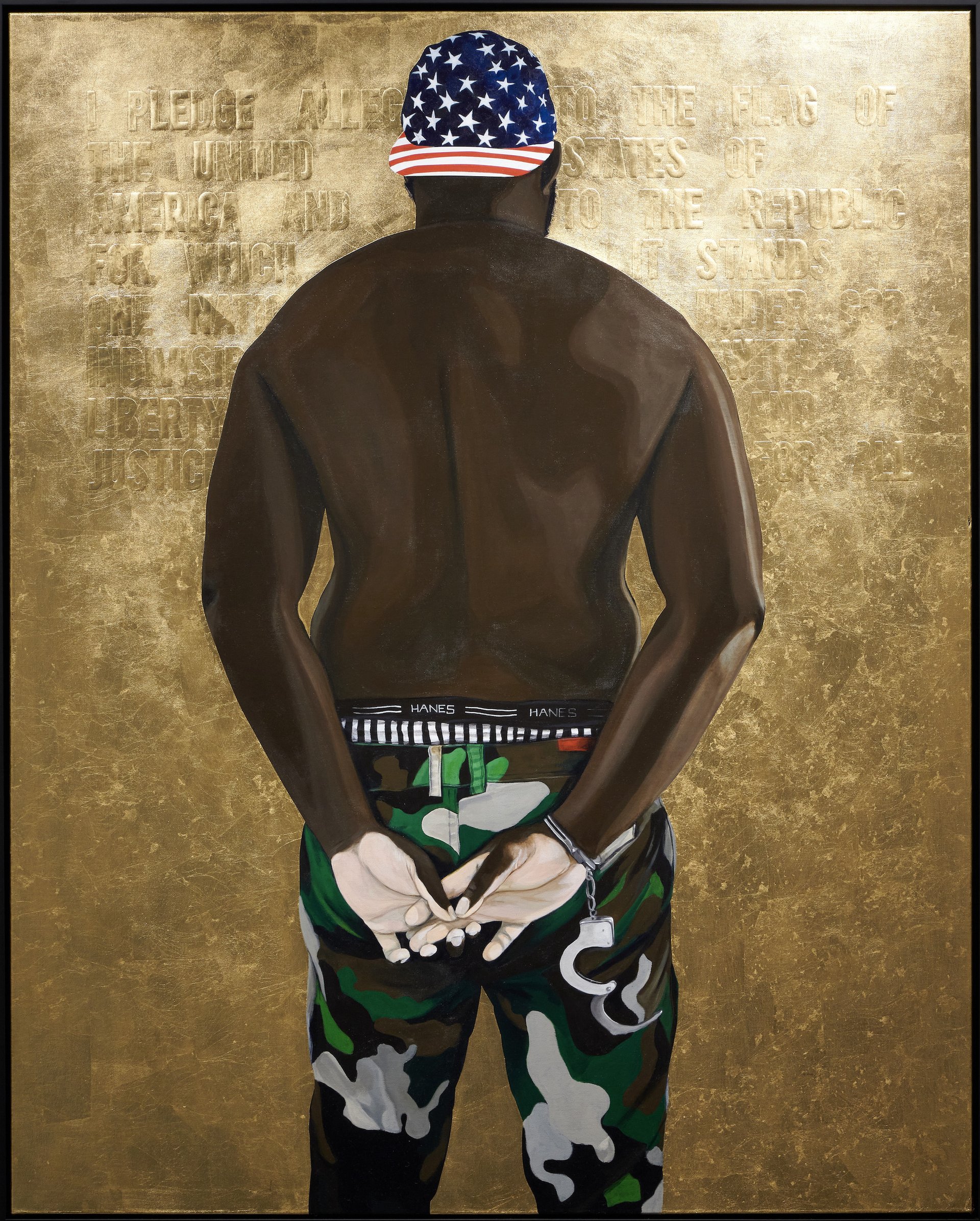 Portraits by Kimberley Pierce Cartwright and Clarence Heyward bookend the exhibition and illustrate the diversity of themes and materials represented. In Heyward’s shirtless self-portrait PTSD (2020), the artist depicts himself with his back to the viewer as he faces the text of the pledge of allegiance, rendered in gilded type. An American flag hat rests on his head. His right hand is not raised to his heart, as is custom; instead it is clasped behind his back with an unshackled handcuff attached. As this symbol of police presence hangs from his wrist, the image begs the question, “With liberty and justice for whom?”