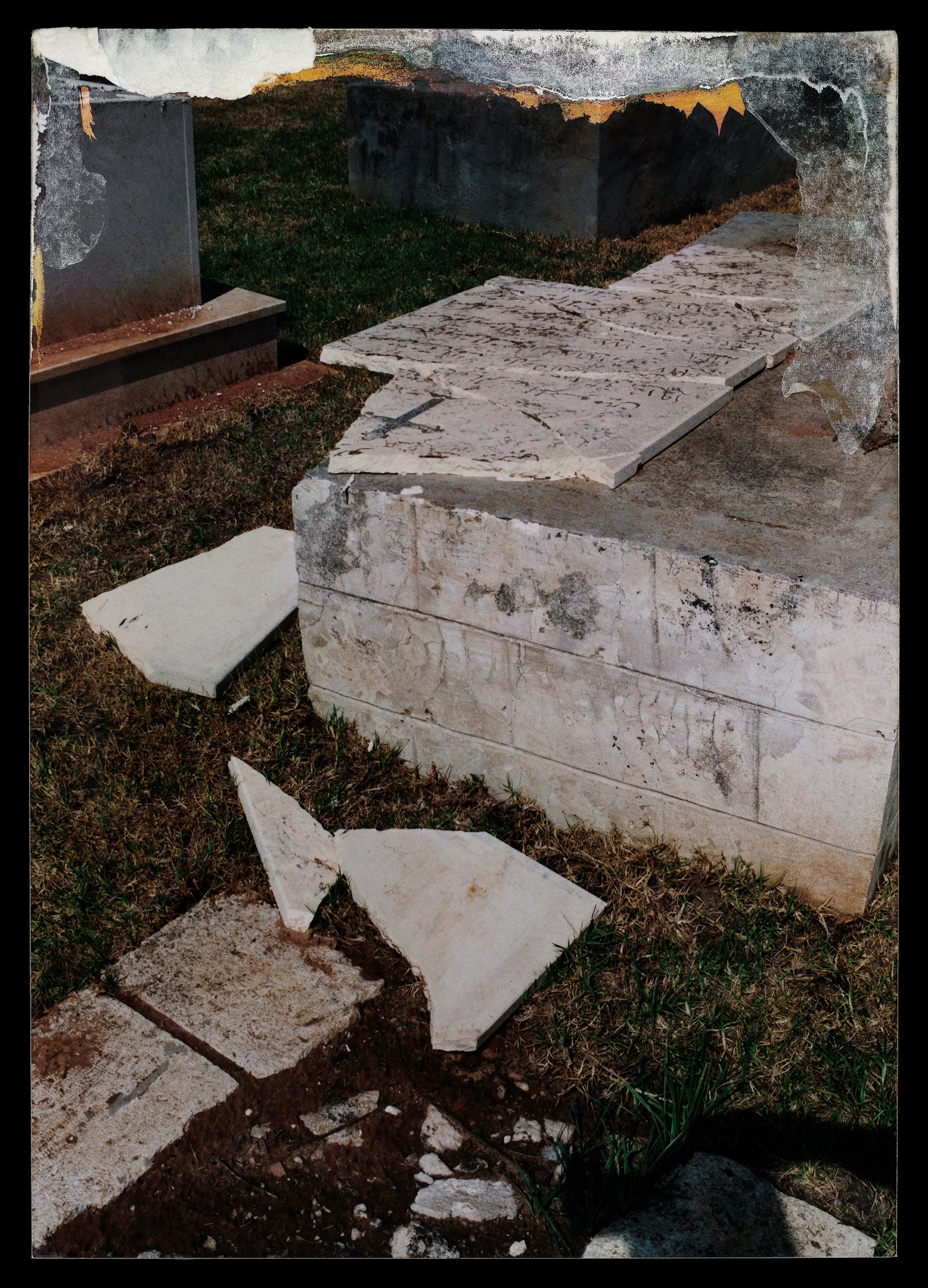 Fragmentation repeats as a formal feature in many the works on view in Catastrophe. Hippos, a video filmed at an ancient Hellenistic site in the Golan Heights, is bisected into two channels—one historic, one contemporary. The Catastrophe series of landscape photographs shows a pine forest planted by the Jewish National Fund after 1948, near Lod where Guez’s family lived, obscuring remnants of Palestinian homes damaged during the Nakba. The photos of these fallen trees and broken archways are splintered into triptychs. Another photographic series, 40 Days (2013), documents the deliberate desecration of family gravestones in Lod with images that are themselves poetically eroded after being stashed in a kitchen drawer (police were unable to use them to find those who perpetrated the hate crime and returned the photos to Guez’s family, who put them in a drawer for years).