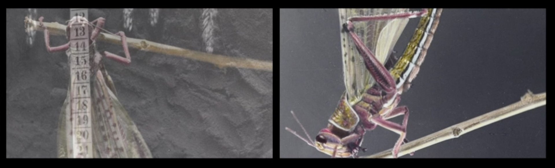In Colony, which Guez has worked on for the past five years, scientific close-ups of locusts and black-and-white footage of insect swarms in British Mandatory Palestine evoke biblical plagues. Images migrate between the film’s three screens to a high-pitched soundtrack of grasshoppers, as ominous narration in Arabic describes invasive colonies with ambiguous language that could apply to either locusts or people. “The ability of organisms to convert from harmless individuals to a synchronized, ruthless unit is unsettling,” says the narrator, in an all-knowing nature documentary tone. Some images almost align between screens, but partitions set them off-kilter.