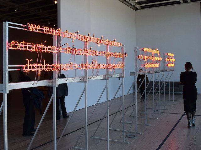 The 2022 edition of the Whitney Biennial, titled Quiet as It’s Kept, features the work of four Indigenous artists from the US and Canada: Rebecca Belmore, Raven Chacon, Duane Linklater and Dyani White Hawk. While the previous edition of the biennial featured a larger number of Indigenous artists, it was criticised by some for relegating most Indigenous art to less-trafficked corners of the show. The works in this edition are exhibited more prominently and parallel other works in their political, conceptual and visual themes.