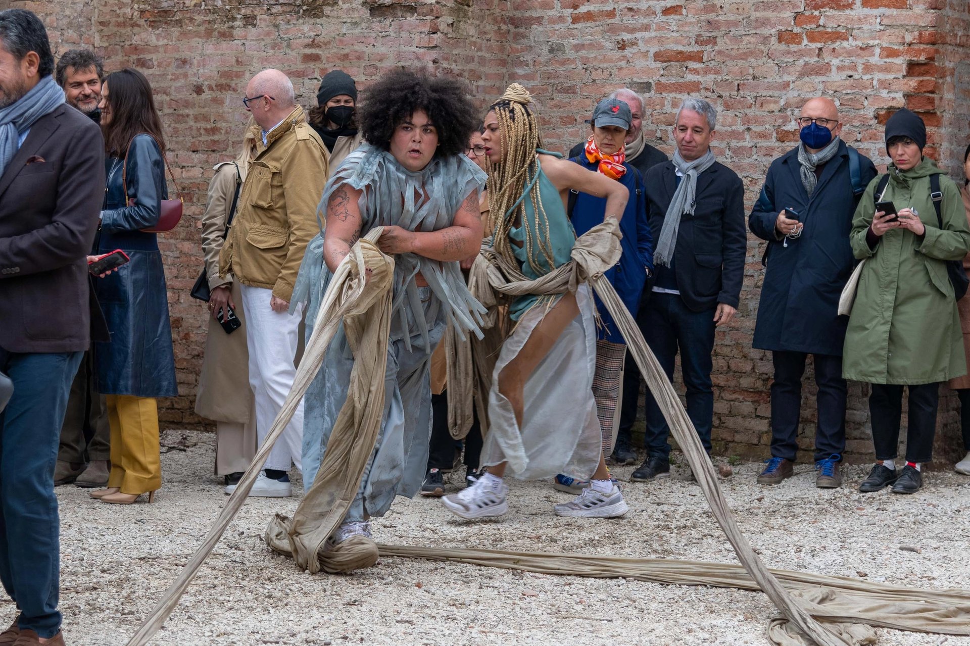A special performance, in the tired watering by the Brazilian non-binary artist Jota Mombaça was staged especially for the assembled art crowd, comprising a series of rhythmic chants and much unravelling of fabric which left some visitors mystified. "The performance attempts to articulate many instances of watery expression, while also opening up space for the various flows of sound and emotion that constitute our relation with a flooding world," Mombaça says in a statement.