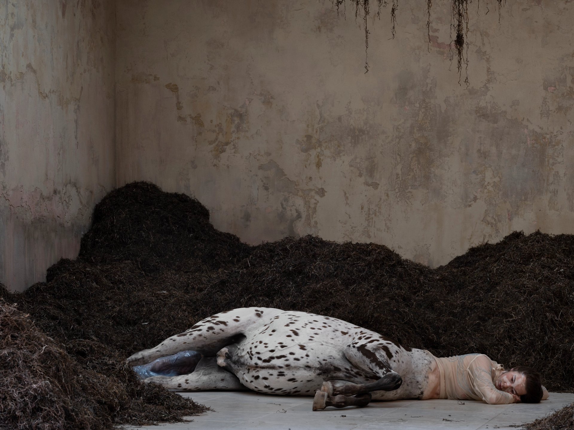 Uffe Isolotto’s “transhuman” installation for the Danish pavilion presents a spectacle that is disturbing and yet ultimately mystifying, failing to deliver any ideas to match the high-spec visuals. There is no denying the cinematic quality of the pavilion’s larger than life protagonists, a pair of hyperreal centaurs realised by a team of taxidermists, zoological model makers and prosthetic makeup specialists. But why are they here?