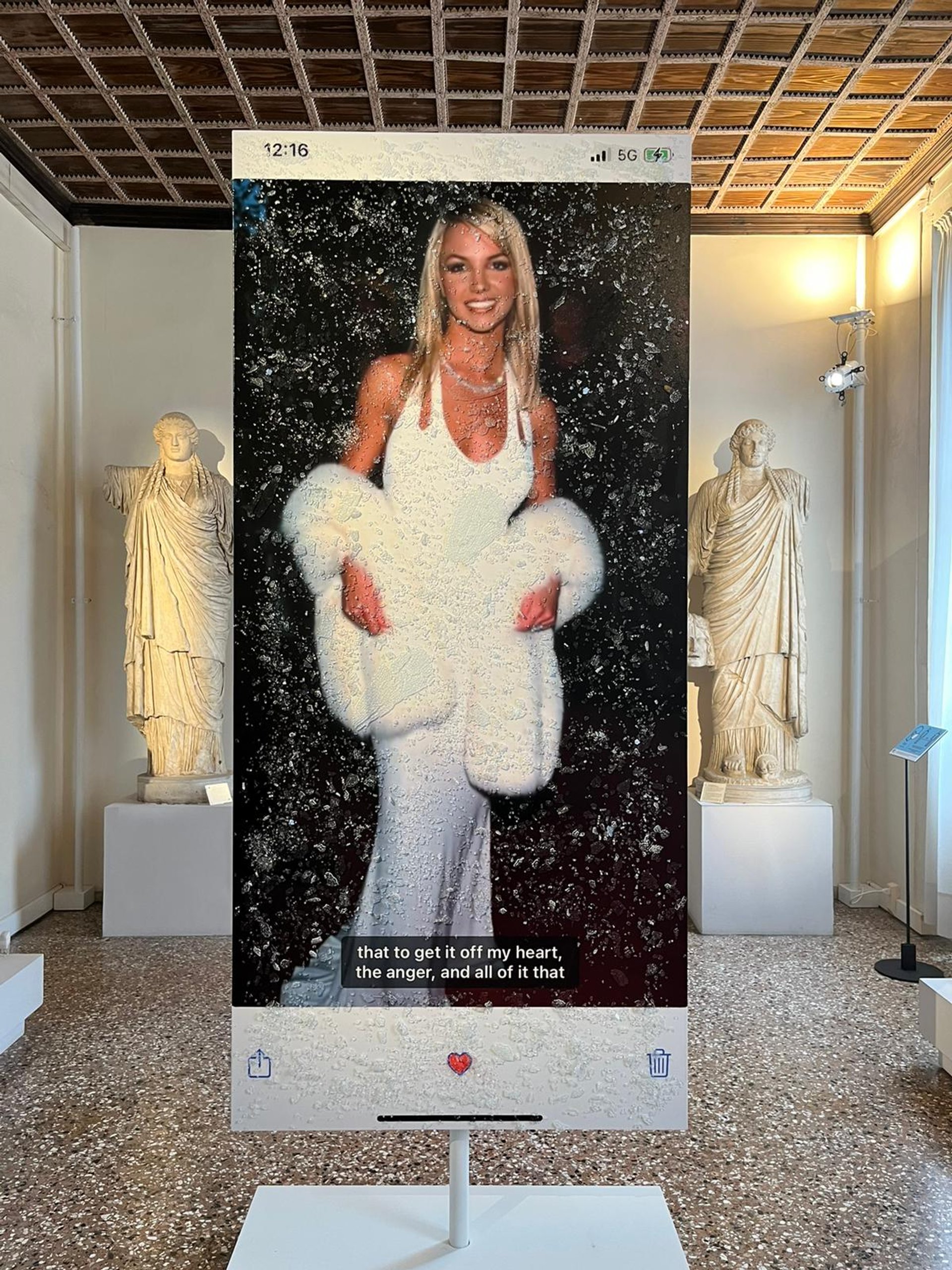 The British artist Marc Quinn has attempted to sum up viral moments from the past couple of years in the exhibition HISTORYNOW, which lines the walls and ceilings of the Museo Archeologico. Screenshots from social media—showing images such as Donald Trump, the storming of the Capitol, a scantily clad Rihanna and a Ukrainian woman with her newborn—have been replicated on giant phone-shaped canvases measuring more than 2m, which have then been daubed and splashed with paint.