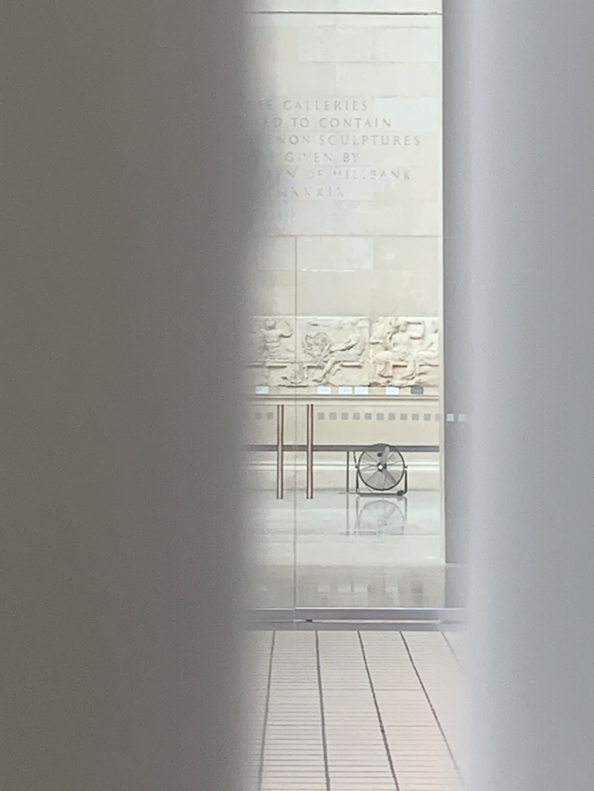 On 10 August 2021, when the Parthenon Marbles were closed to the public, we photographed this fan positioned near the ancient frieze through the gap in the gallery door © The Art Newspaper