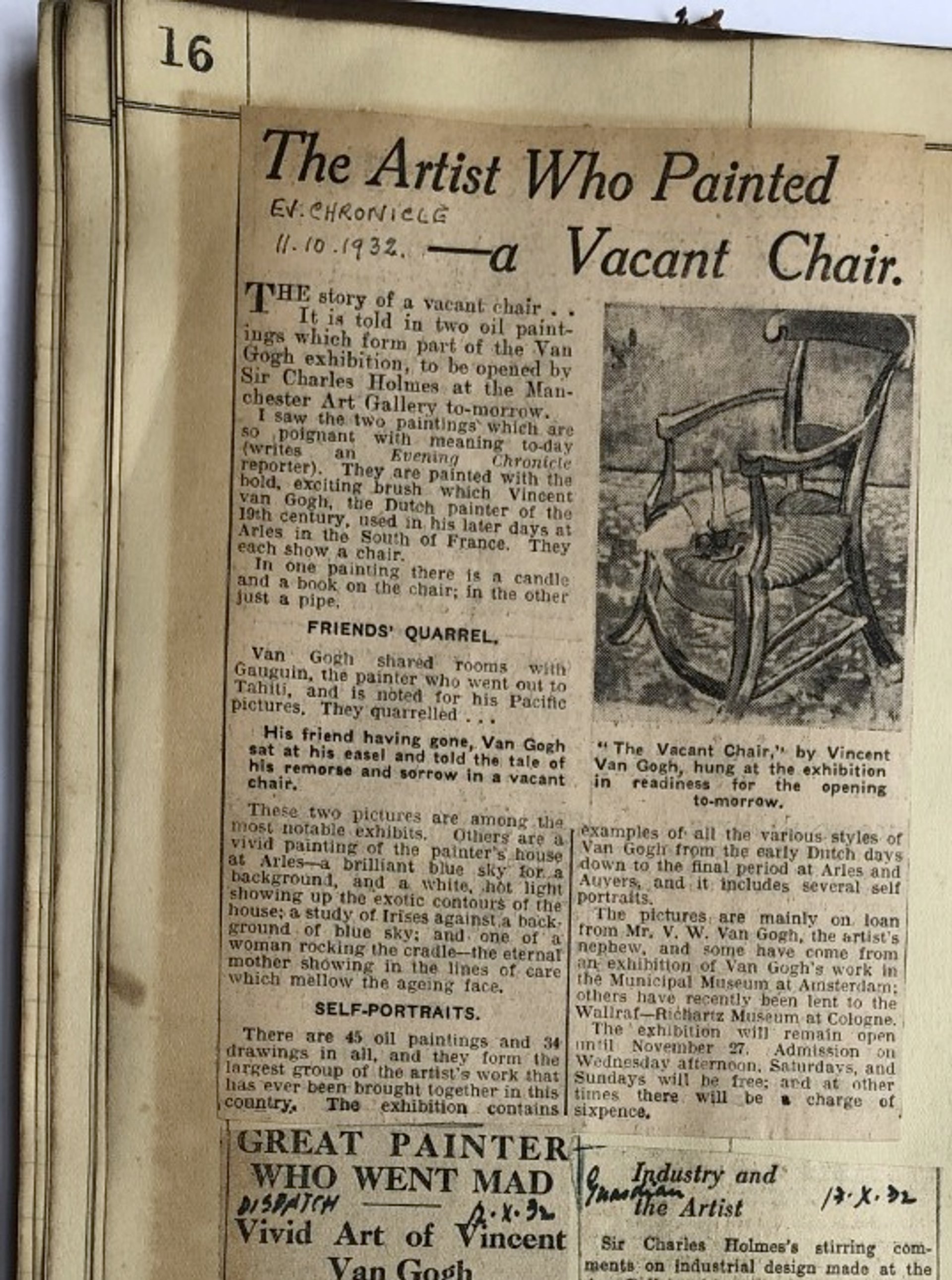 Manchester Evening Chronicle, 11 October 1932, with an article on the city’s Van Gogh exhibition (a cutting in an album at Manchester Art Gallery) Credit: Manchester Art Gallery