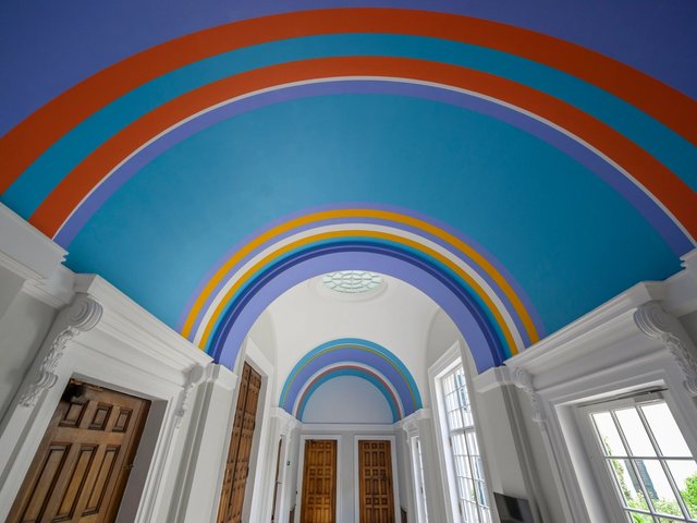 On the ground floor we find a sequence of works owned by the Collection and made in 2017 to be exhibited together: Ei/Egg, Laterne/Lantern and Schädel/Skull. Their equal monumental scaling and vivid colouring—typical of Fritsch’s decision-making process—demand a different kind of attention, while, seen together, these objects complicate one another’s meanings further. In this way the artist creates new narratives and atmospheres. There is also the push and pull of pieces that look like they can never have been made by hand and whose application of paint confuses our sense of light and time of day; the lantern, for example, seems to both emanate and absorb light.