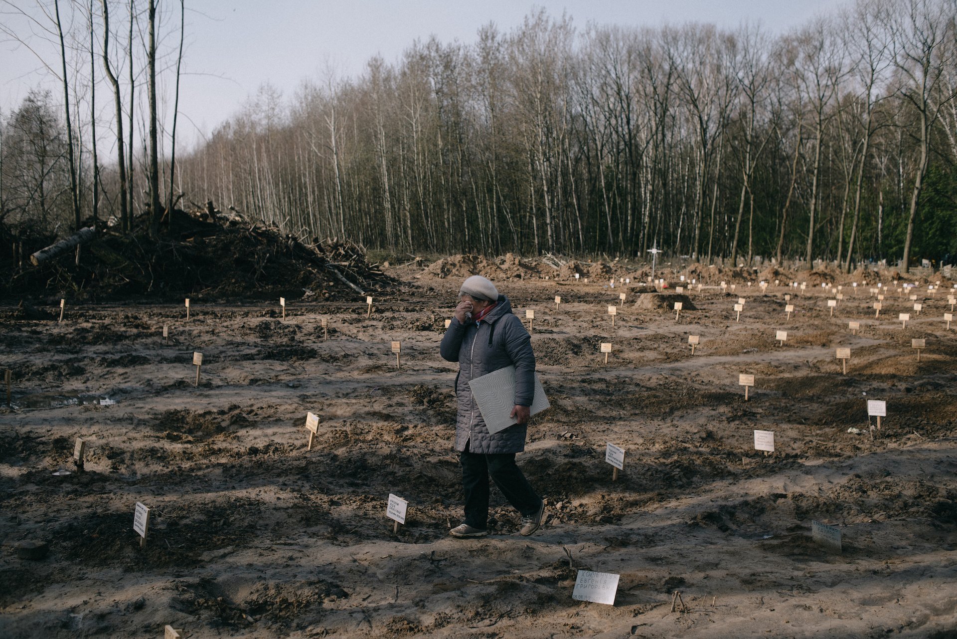 Because of intense shelling and air strikes, people had to bury those who died in long ditches in a hurry, putting a sign with the name near each body. After the battles ended and the city was released from the Russian Army, people return to the city and try to find their relatives on this cemetery. 10.04.2022 Chernihiv © Maxim Dondyuk, courtesy PinchukArtCentre