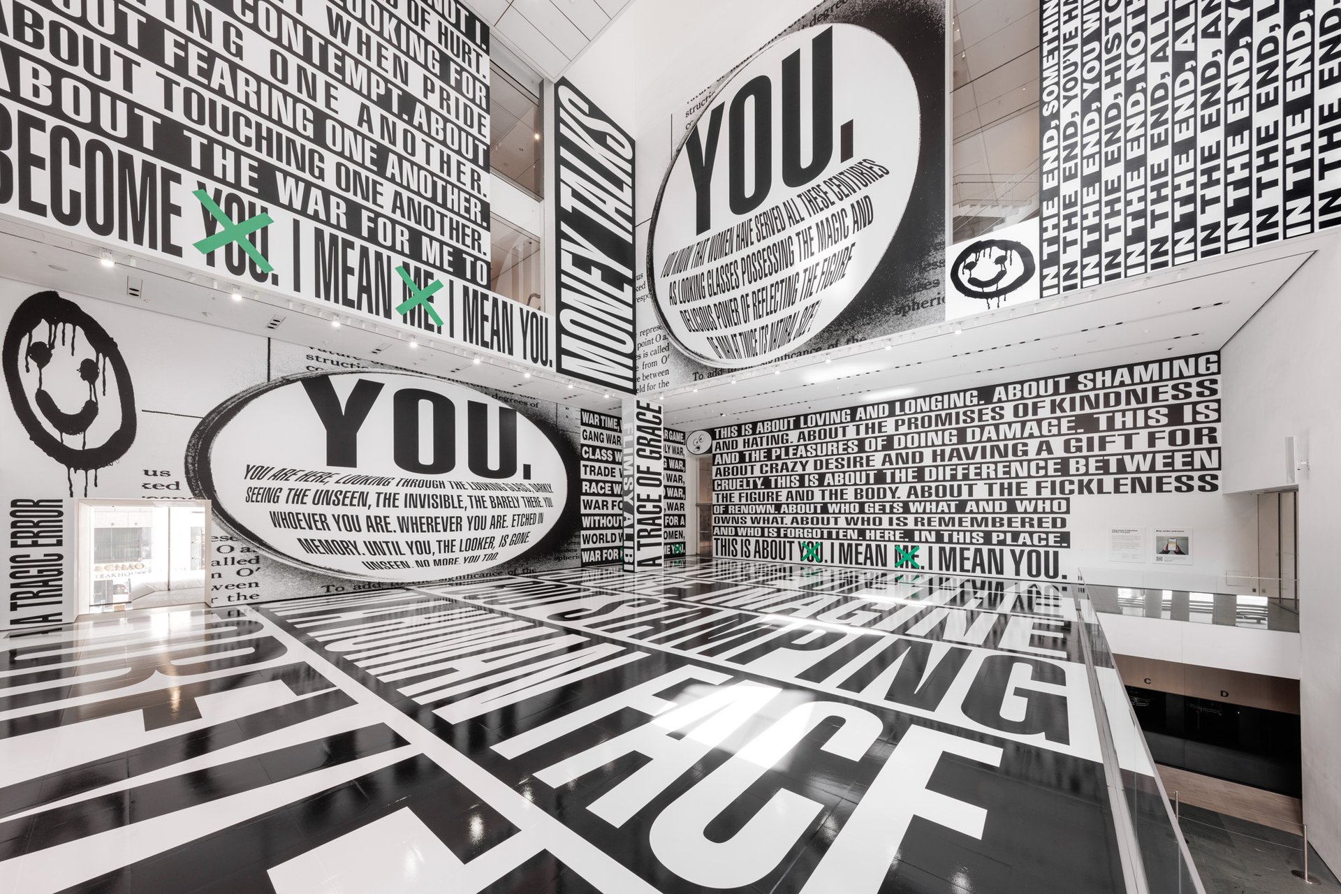 At the Museum of Modern Art (MoMA), a concurrent immersive Kruger experience fills the museum’s central atrium with alternating black and white bands of text, drawn from a repertoire of stock phrases recycled from other bodies of work: “Money talks”, for example, or “The moment when pride becomes contempt”. It’s sometimes difficult to discern what is intended to be facetious from what is meant to be read as sentimental. According to one wall, “This is about loving and longing”—but what about living and laughing?