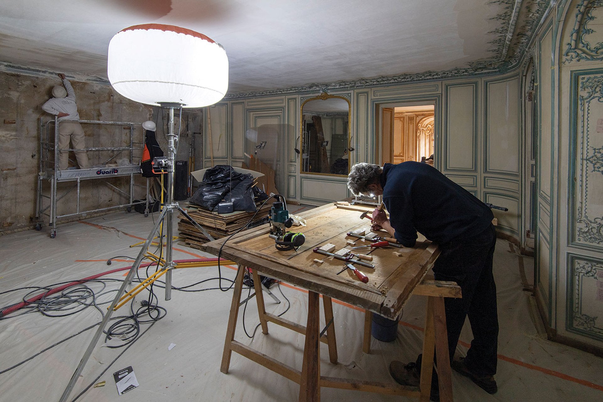 To complete the restoration, matching paints have been prepared to 18th-century formulations using natural pigments and then applied over a layer of rabbit-skin glue and chalk from the original quarries in neighbouring Meudon. Gilding has been burnished and missing gold leaf meticulously replaced. The apartment has also been refurnished with period pieces from the Versailles storerooms.