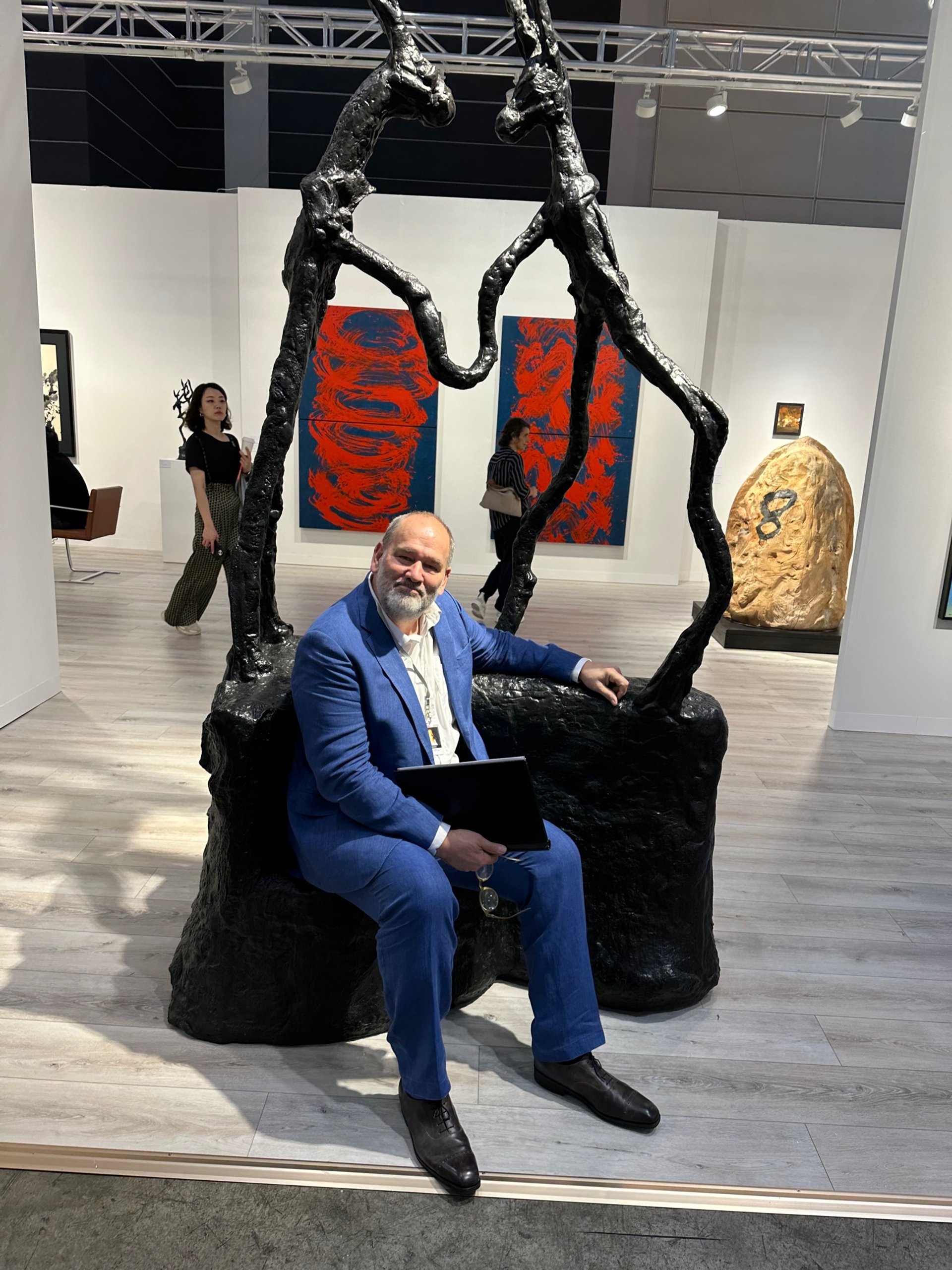 Visitors to Art Basel Hong Kong are usually strictly forbidden from touching the art. But fairgoers can, to their surprise, sit on a large-scale sculpture by Barry Flanagan at the stand of Waddington Custot. A steady stream of happy individuals, no doubt keen to rest their tired aisle-darting feet, have taken up Jacob Twyford’s offer to perch on The Handshakers piece depicting two huge rabbit-esque figures joined at the hand (or paw). Twyford, senior director at the London-based gallery, says that the sitting statue is “all about saying hello, all about love”. And we all need a little bit of that.