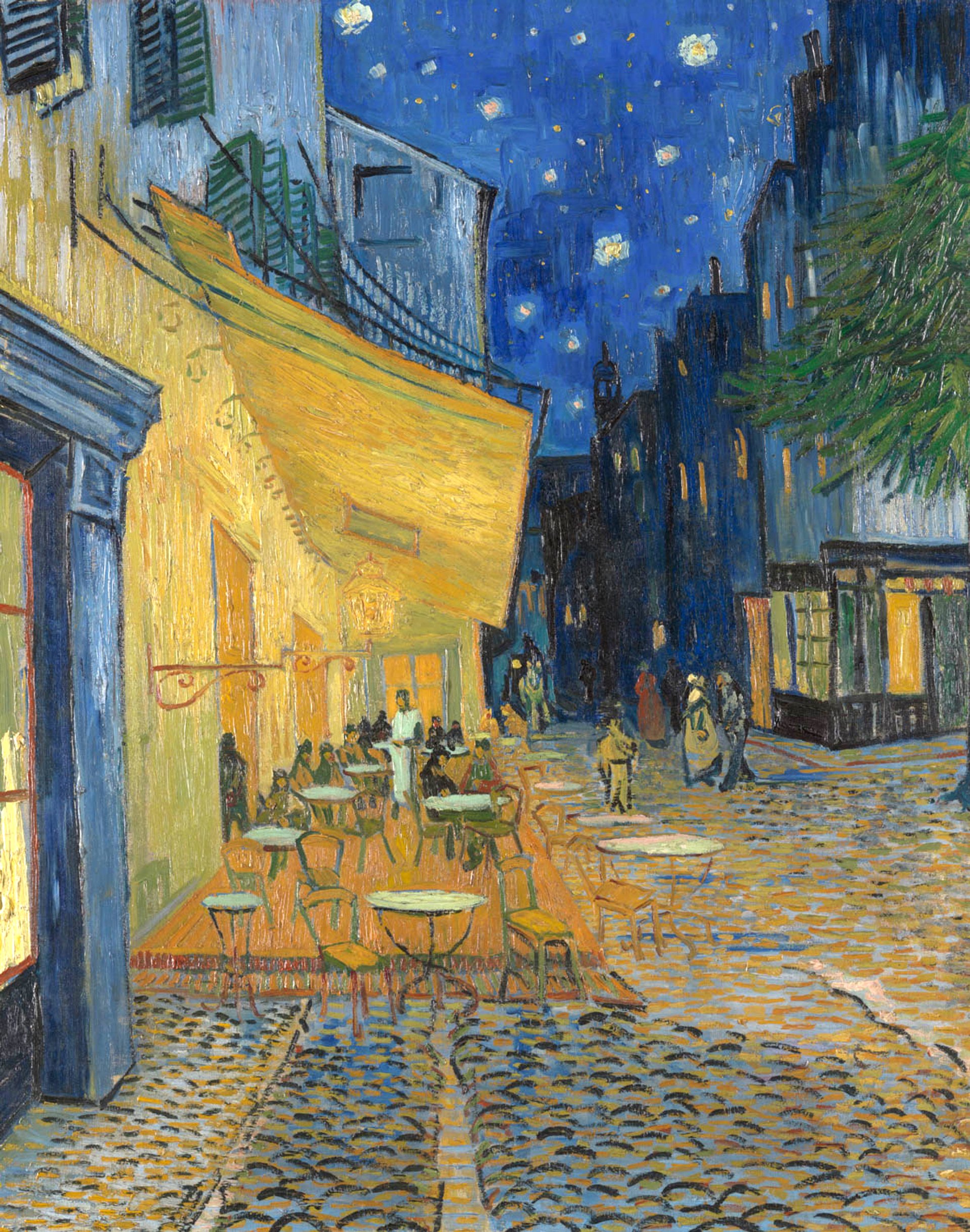 Writing to his sister Wil, Vincent gave a detailed description of his picture: “On the terrace, there are little figures of people drinking. A huge yellow lantern lights the terrace, the façade, the pavement, and even projects light over the cobblestones of the street, which takes on a violet-pink tinge.” It was, he concluded, “a painting of night without black”.