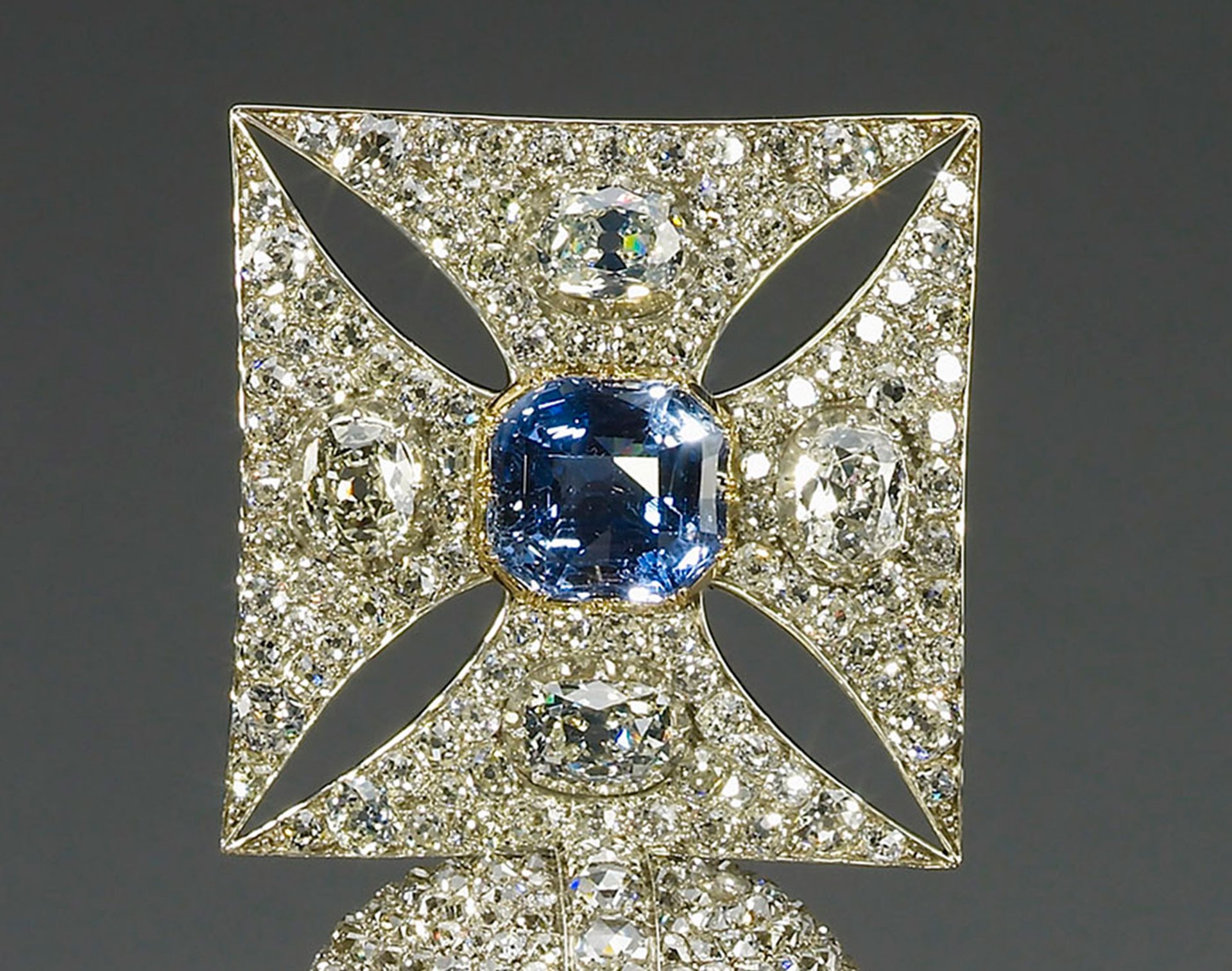 The sapphire from the tomb of St Edward the Confessor is set in the cross of the Imperial State Crown. Originally a cabochon, it was faceted in the reign of Charles II Royal Collection Trust / © His Majesty King Charles III 2023