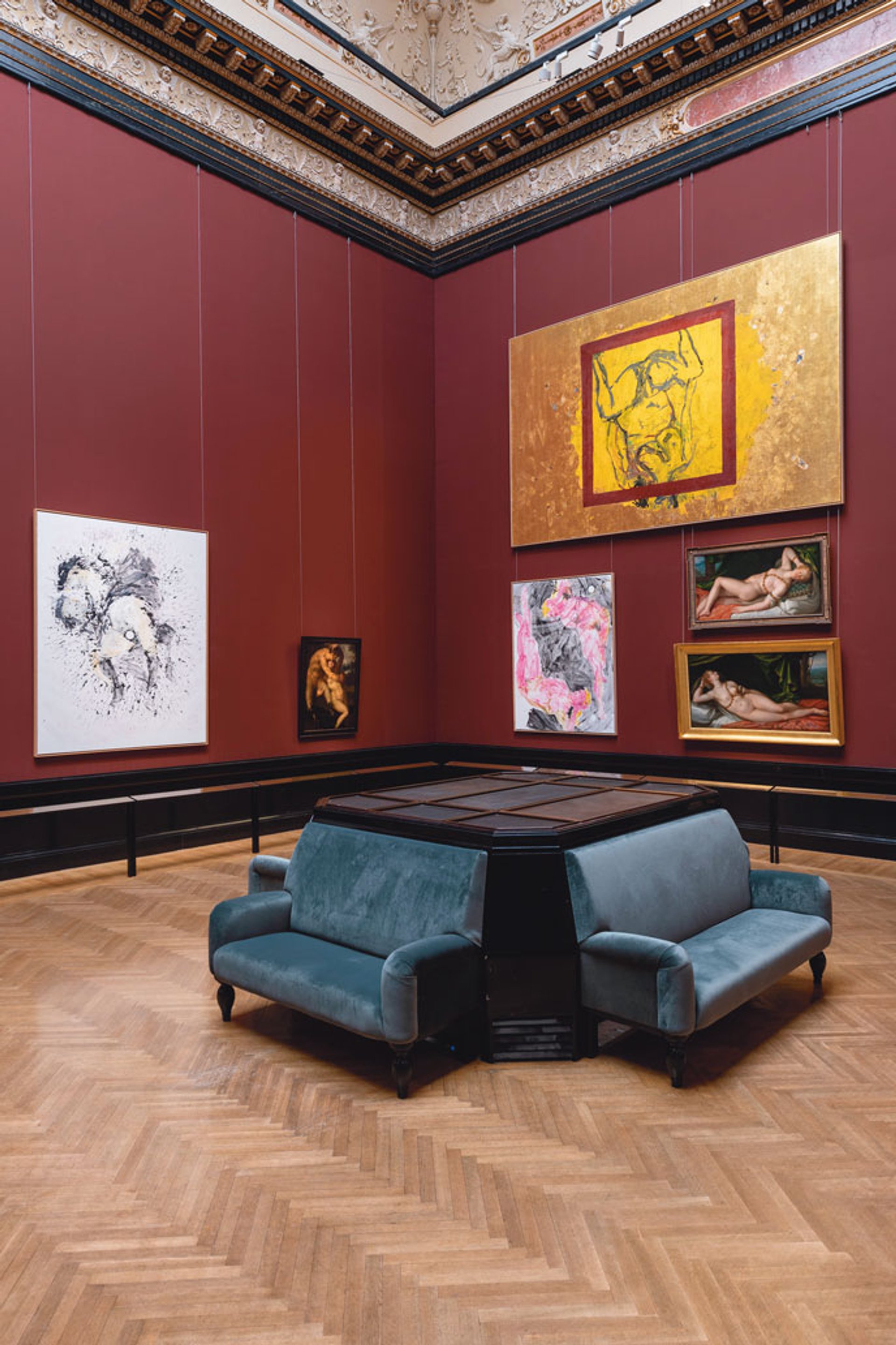 In this gallery, devoted to decadence and desire, the boldest combination is Picture-thirty-two (1994), an image of a woman (Baselitz’s wife Elke), shown upside down and crouching naked, drawn with thick black paint placed on a gold ground, with an inner pictorial frame of burnt sienna. It hangs above two kitsch lounging nudes by Dirck de Quade van Ravesteyn. The weighty golden Elke seems to compress the two polished Ravesteyn bodies into one doubly bad painting. Alongside, Baselitz’s Ade Nymphen (1998) shows two pinkish nude females, floating around the edge of the canvas, as if decompressing the Ravesteyns. The Baselitz is a strangely beautiful painting with its garish colours, ungainliness, red lips and earth-coloured genitals, and dirty, coal-grey grounds, starkly punctuated by blank discs (made by the paint tins Baselitz uses to keep his canvas flat while painting).