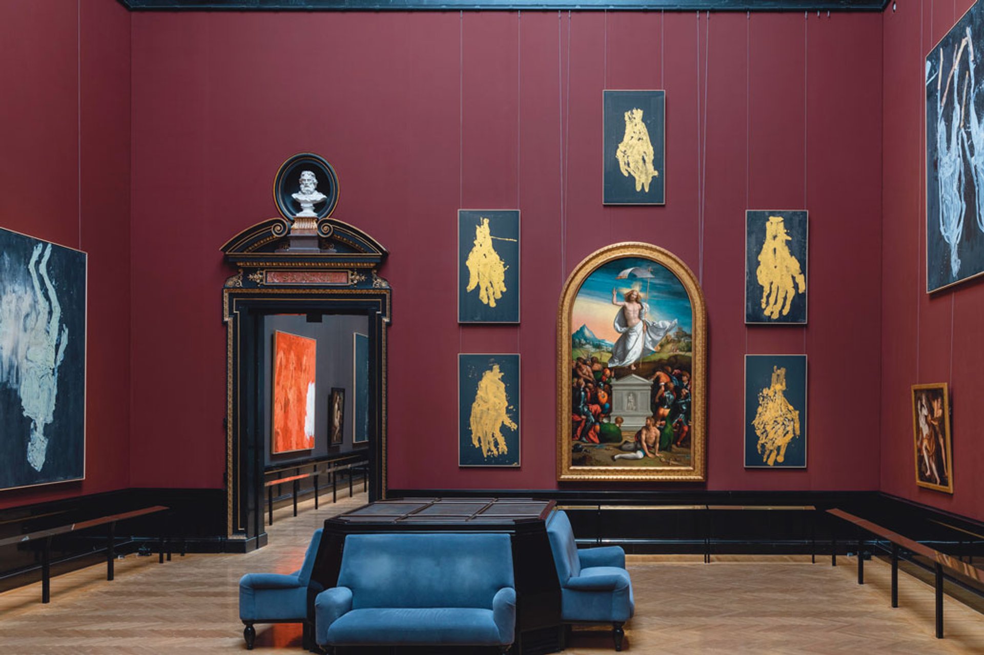 Baselitz's paintings of golden hands hung around Garofalo’s Resurrection of Christ (1520), which was too big to be moved © KHM-Museumsverband