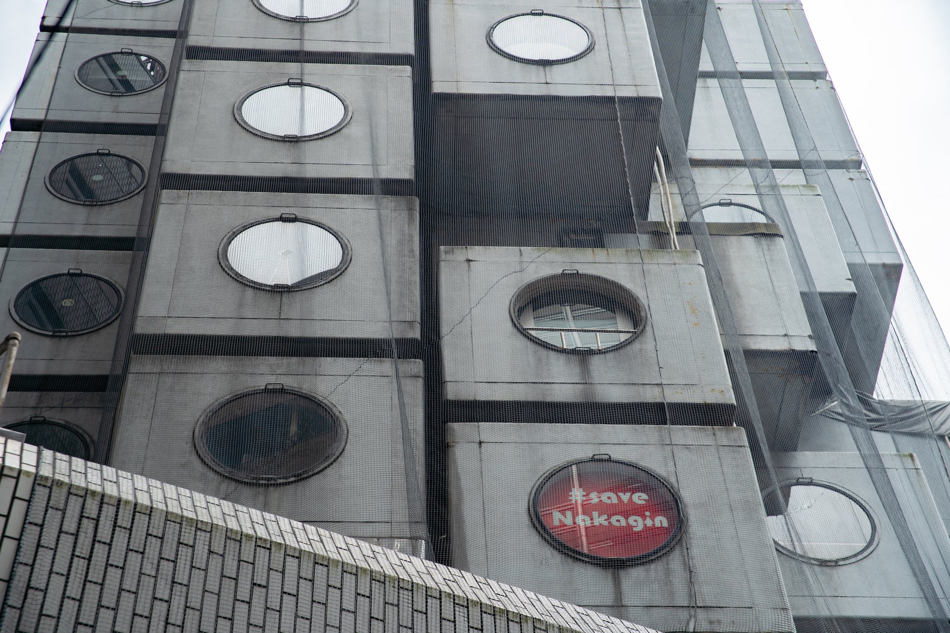 The exterior of the Nakagin Capsule Tower in 2021 Photo by Dick Thomas Johnson, via Flickr