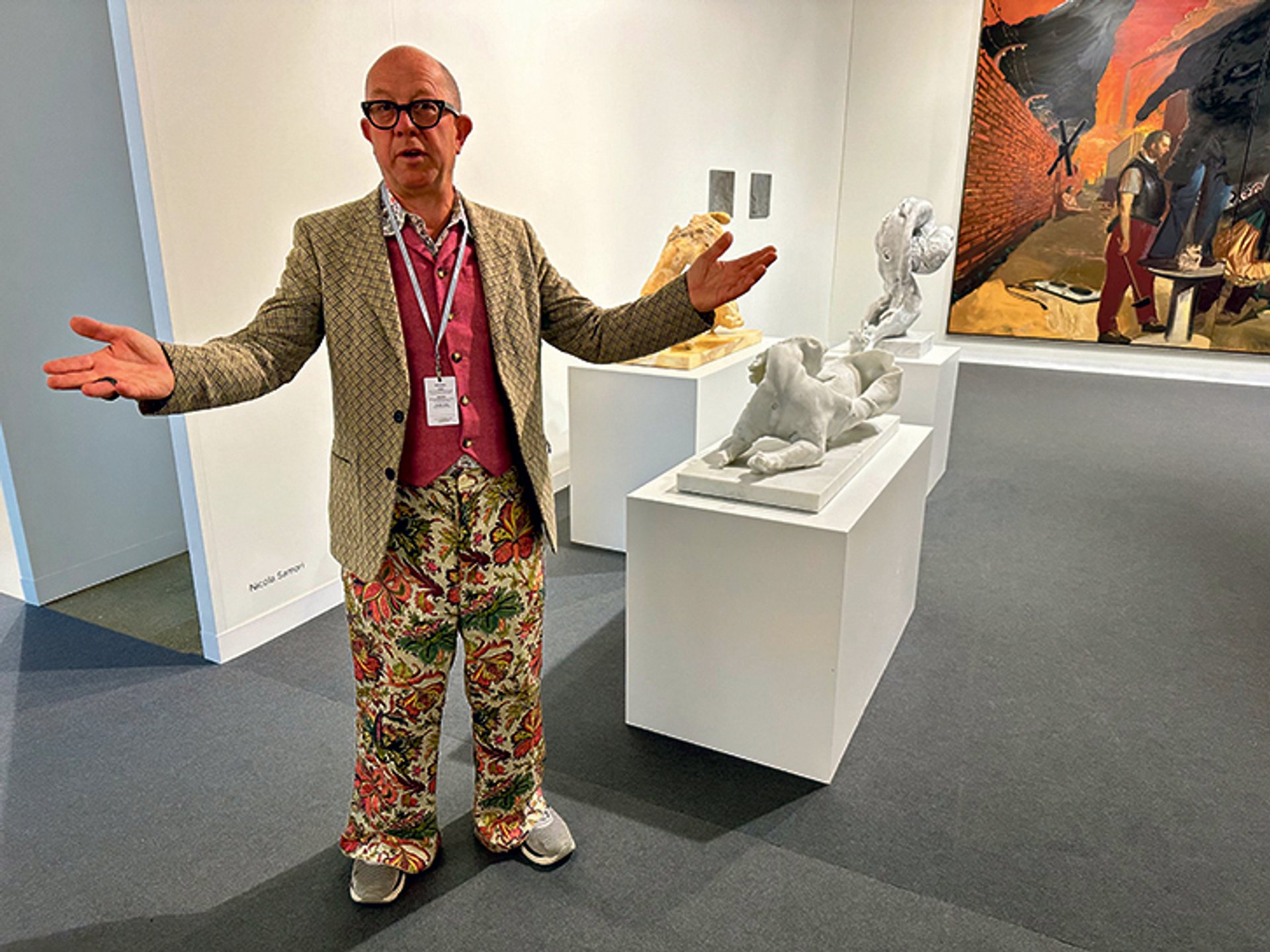 The German dealer Gerd Harry Lybke’s colourful outfits have become a fair staple, catching the eye of visitors browsing the aisles at Art Basel. His trousers emblazoned with flora and fauna are certainly eye-popping, with Lybke explaining that his fashion choices are often inspired by his artists. “I’m a groupie for all of them, including Neo Rauch,” he says. “I modelled naked for him in the 1980s in Leipzig; I charged 8DM for clothed portraits and 12DM for naked life-drawing classes.” Talk about naked ambition.