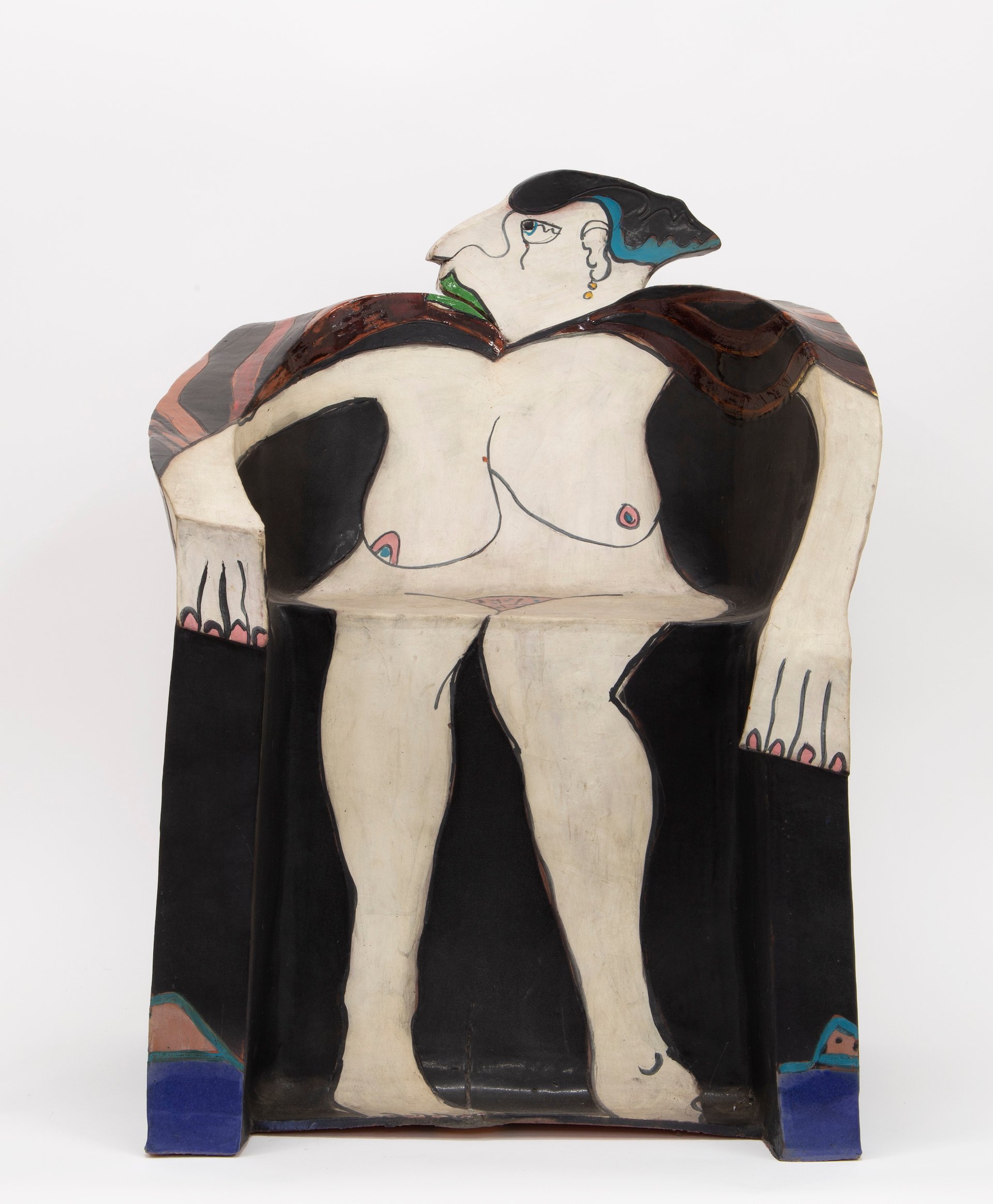 New York gallery Ryan Lee’s stand is the epitome of this juxtaposition of the solemn and the droll. Its three-artist presentation, titled we were there: activist art 1968 to 1981, includes works by Camille Billops (1933-2019), Vivian Browne (1929-1993) and May Stevens (1924-2019). The feminist artists were all friends, and each pokes fun at the patriarchy in her own way. Browne’s Little Men oil paintings show powerful white men as toddlers having tantrums, while Stevens painted repetitions of a self-serious man with glasses and a bulldog in his lap. But the highlight here is Browne’s set of four etchings in different colours, I am Black, I am Black, I am Dangerously Black (1973), poking fun at the odalisque, as well as an enchanting glazed-earthenware chair sculpture with a nude rendered on it so that a sitter falls right into the figure's lap, Madam Puisay (1981)—on view recently in the Museum of Modern Art’s Just Above Midtown exhibition.