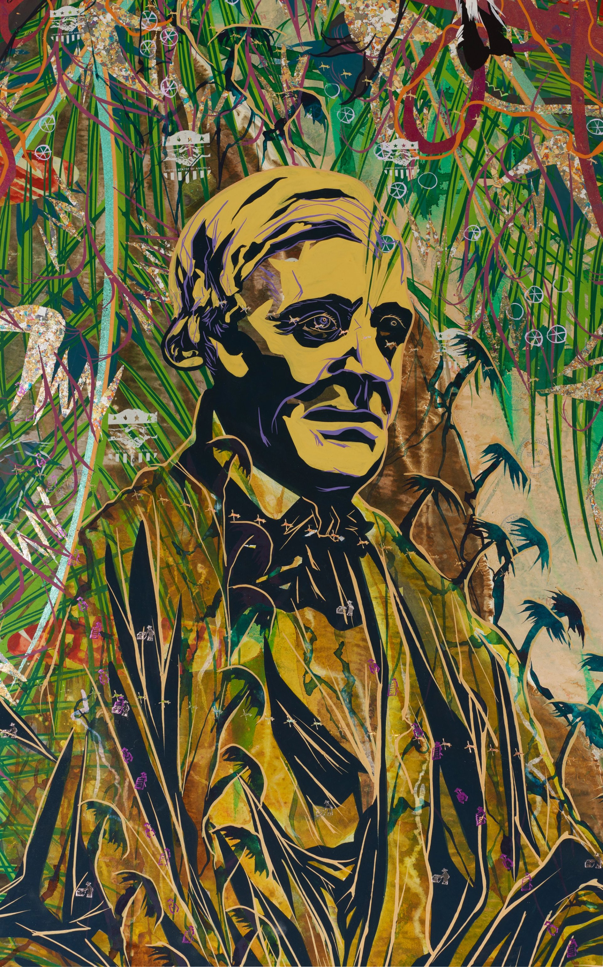 Nguyen’s parents arrived in the US as refugees after the American military’s withdrawal from Vietnam in 1975, and the spirit of diaspora has impacted her work since her time at Yale University’s MFA programme in the early 2010s. Her self-titled solo show at the Institute of Contemporary Art (ICA) in Boston boxes with the distinctly American specter of Ralph Waldo Emerson, father of transcendentalism and the cult of “self-reliance”, the utopian basis for some of his country’s cruelest bits of foreign policy. Emerson’s 1836 essay, “Nature”, elevates its subject to the realm of the divine, a portal to godliness achieved through thoughtful, masculine isolation. Nguyen’s acid-hued flora, however, encroaches on her canvases' central figures—Emerson, Jesus, the Greek goddess of the harvest Demeter and and Ngô Đình Diệm, the final, ill-fated prime minister of South Vietnam—like an overgrowth of memory, a reminder of nature’s fierce, feral independence from the whims of whiteness.
