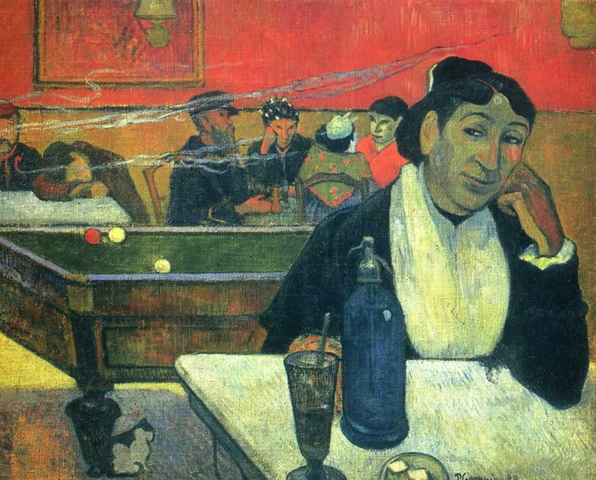 When Paul Gauguin arrived in Arles, a month later, he made his own painting of the café interior. Gauguin portrayed the room from the left side, showing Marie Ginoux in a pensive mood, a glass of absinthe at hand. The café’s cat cowers beneath the billiard table. This painting also later ended up in the Morosov collection in Moscow.