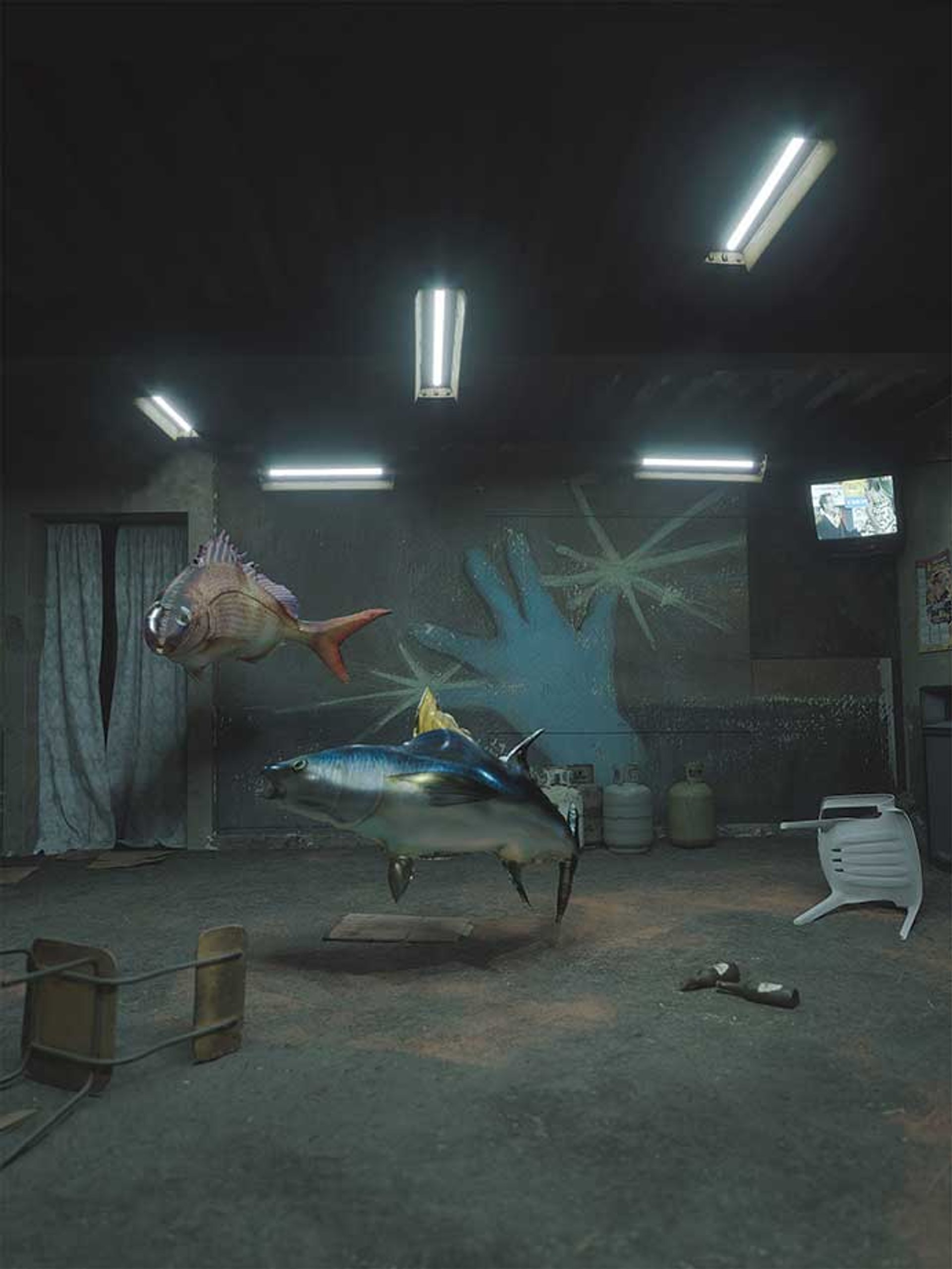 In Opaque Spirits, the Peruvian-born artist Arturo Kameya turns Marres into an ailing, haunted hotel. The façade of Marres House for Contemporary Culture features large-scale paintings of Messianic imagery, and the interiors are transformed by Surrealist murals and bizarre, immersive scenography: a tiled bath house that doubles as a restaurant; large-scale sculptural fish suspended in mid-air. Wan, fluorescent lighting matches the greenish patina the artist applied to the walls, evoking the supernatural luminosity that frequently appears in his paintings.