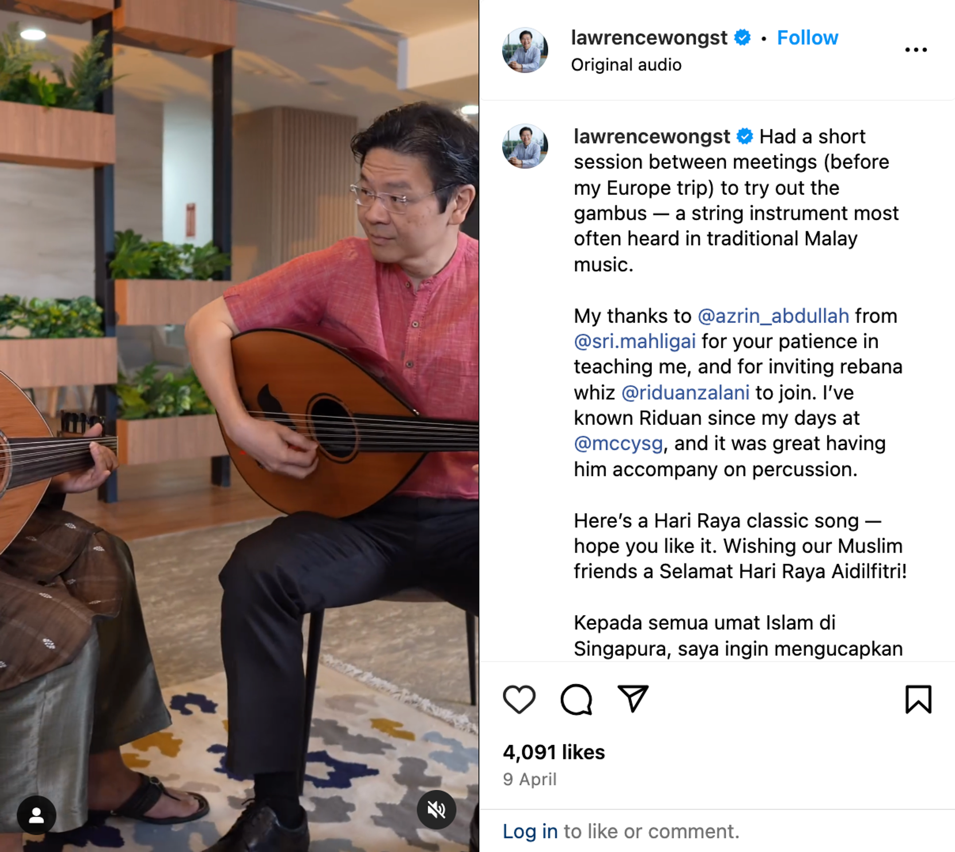 One of Lawrence Wong’s recent Instagram posts showed him learning to play the gambus, an instrument regularly heard in traditional Malay music. He also regularly shares footage of himself playing guitar