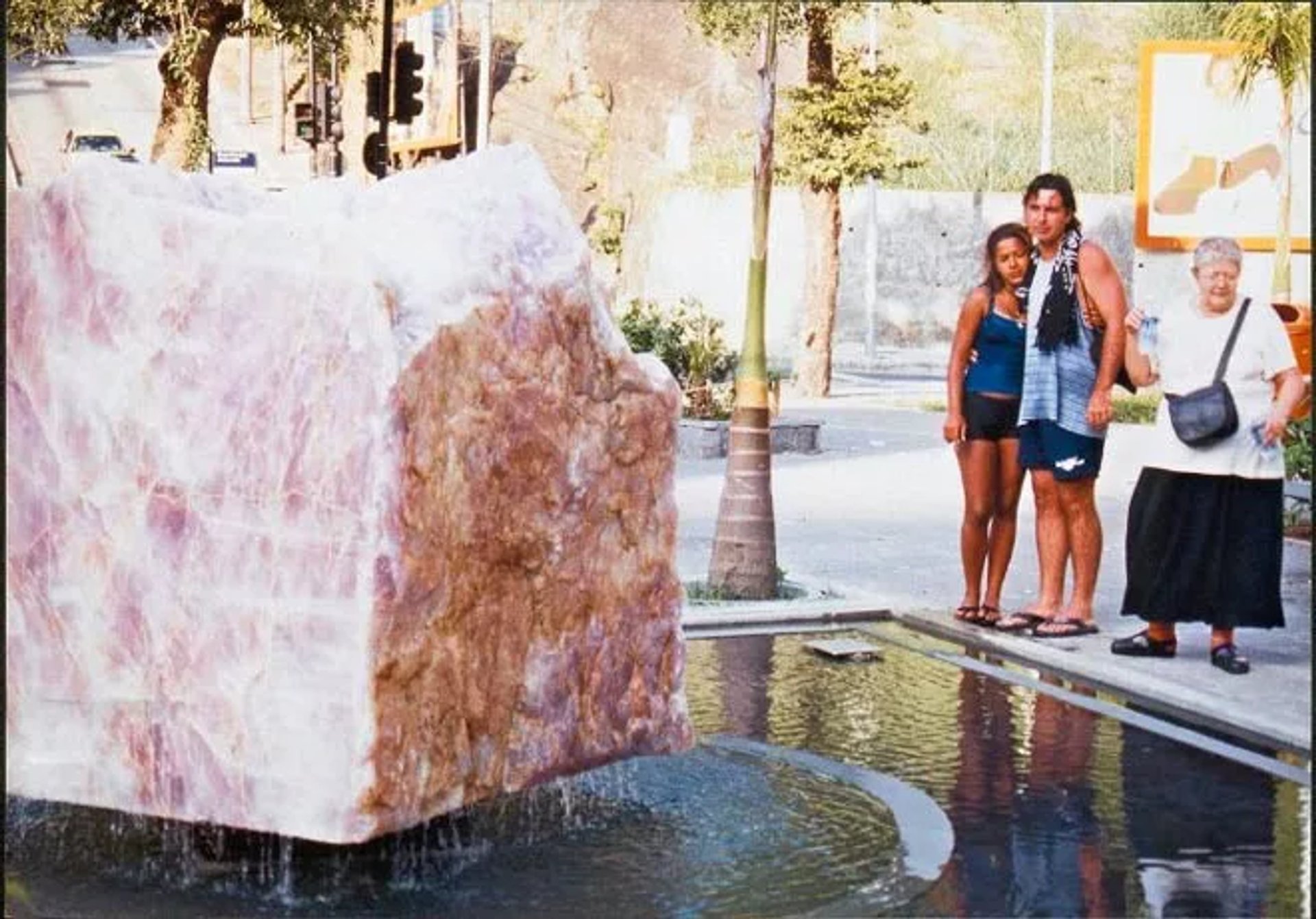 The restoration, its first since the work was unveiled, involves refilling the reflecting pool and restarting the fountains, restoring the containment wall and cleaning the rose quartz to recover the light and colour of the crystal. The asymmetrical block with striking pink and white veins was quarried in the northeastern Brazilian state of Rio Grande do Norte.