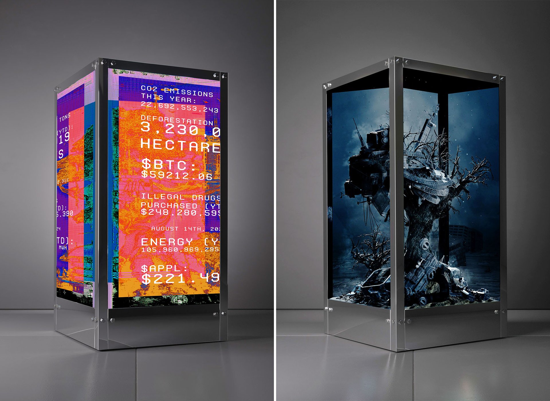 THE TREE OF KNOWLEDGE features four video screens arranged in a rectangular pillar, with the screens displaying an endless video of a tree with industrial elements resembling a rig scaling its height. Imagery generated from a variety of real-time data—including news channels, stock and cryptocurrency tickers, environmental data and social media—disrupts this feed, and viewers can choose what reality they see on a range from “signal”, meaning order, to “noise”, meaning chaos. The work will be on view in New York City beginning in early October, at Lingotto's New York office near the central branch of the New York Public Library.
