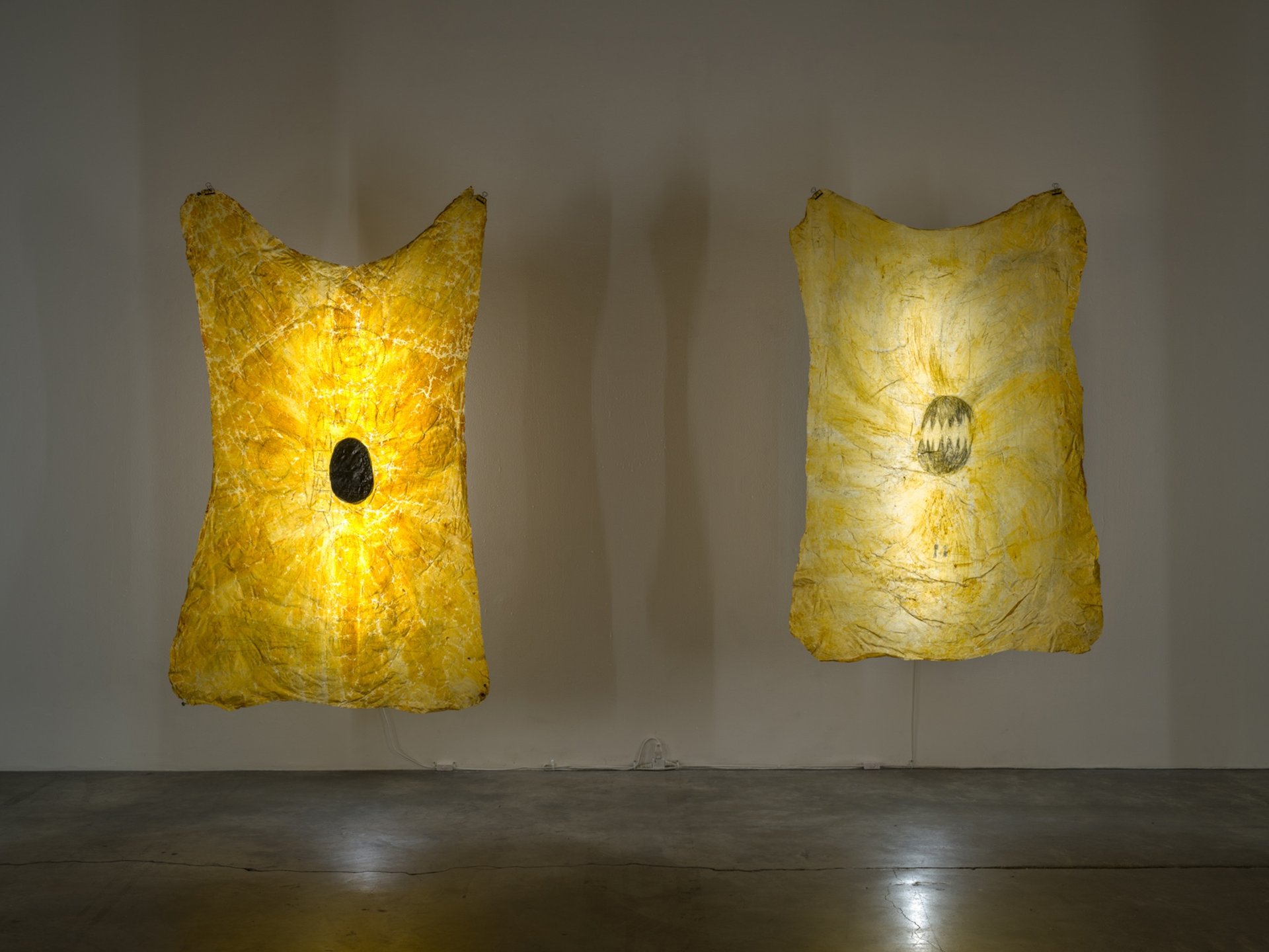 The two series of large-format works in the show, not seen since the artist’s death, are also alive in ways that are hard to describe. Butler made mixed-media paintings known as the invisibility veils (1992-96) on silk sheets stiffened with rabbit glue, so they appear like animal hides or skins. Her daughter, the artist Corazon del Sol, describes finding them in deep storage all gummed together and having to carefully steam them to separate the works.