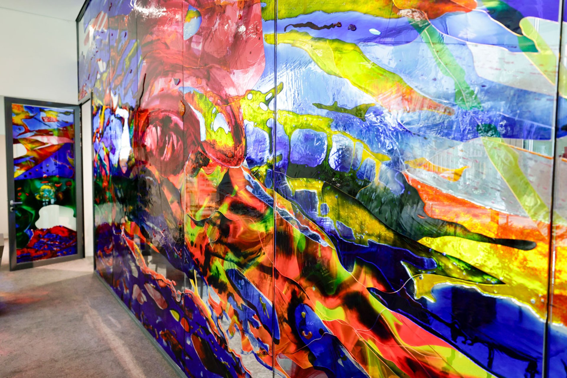 When colour and space become one: Ein Glas Wasser, bitte is Katharina Grosse’s first work on glass and the wall to the colour lab Photo: Sascha Kopp. Katharina Grosse, Ein Glas Wasser, bitte, 2024 © VG Bild-Kunst, Bonn, 2024
