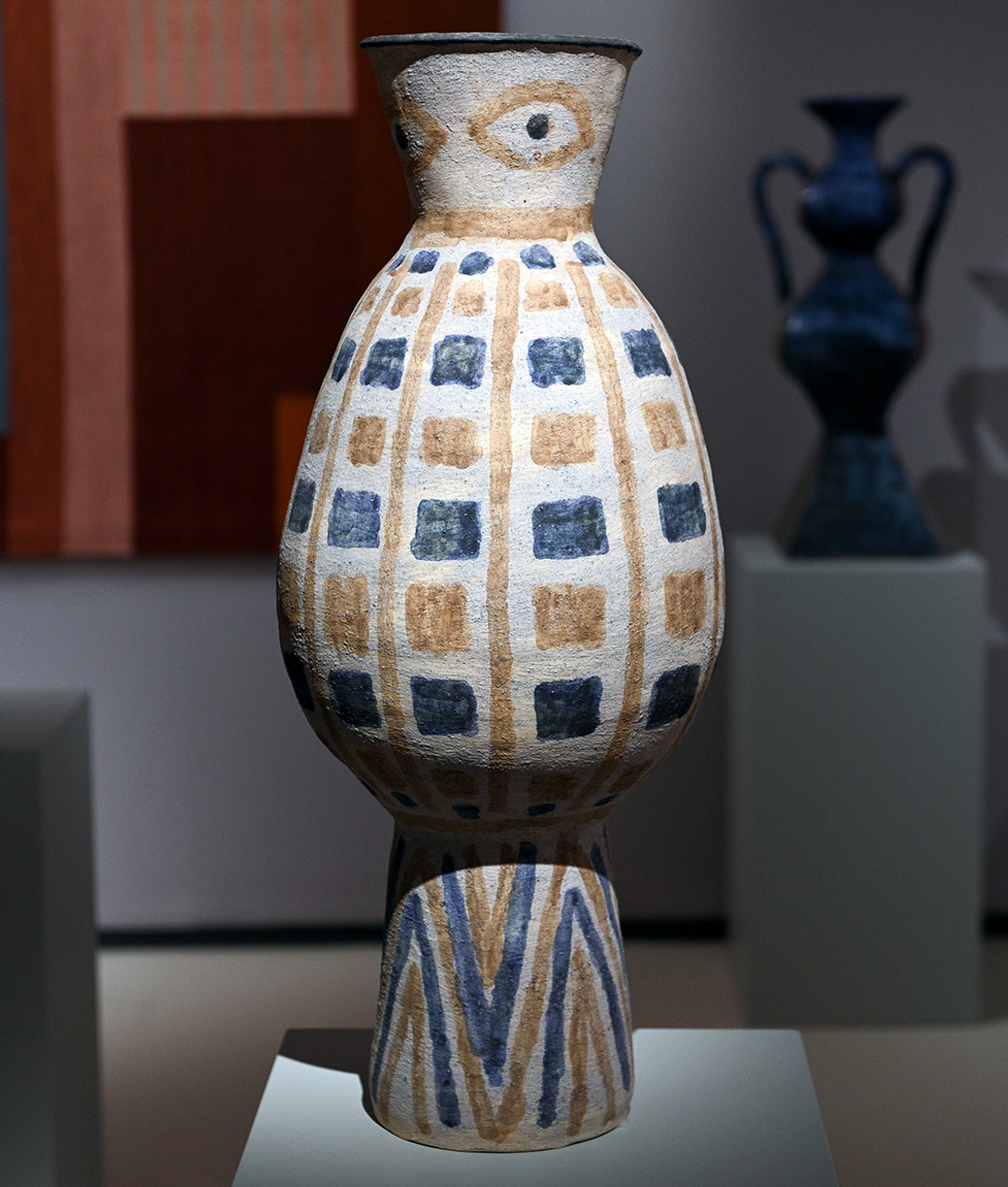 Schlesinger began making ceramics after returning to the US, creating large-scale works that recall antiquity. The prize-winning piece, which has sold for £35,000, is a sandy-textured pot with blue and gold patterning—and eye motifs towards the lip.