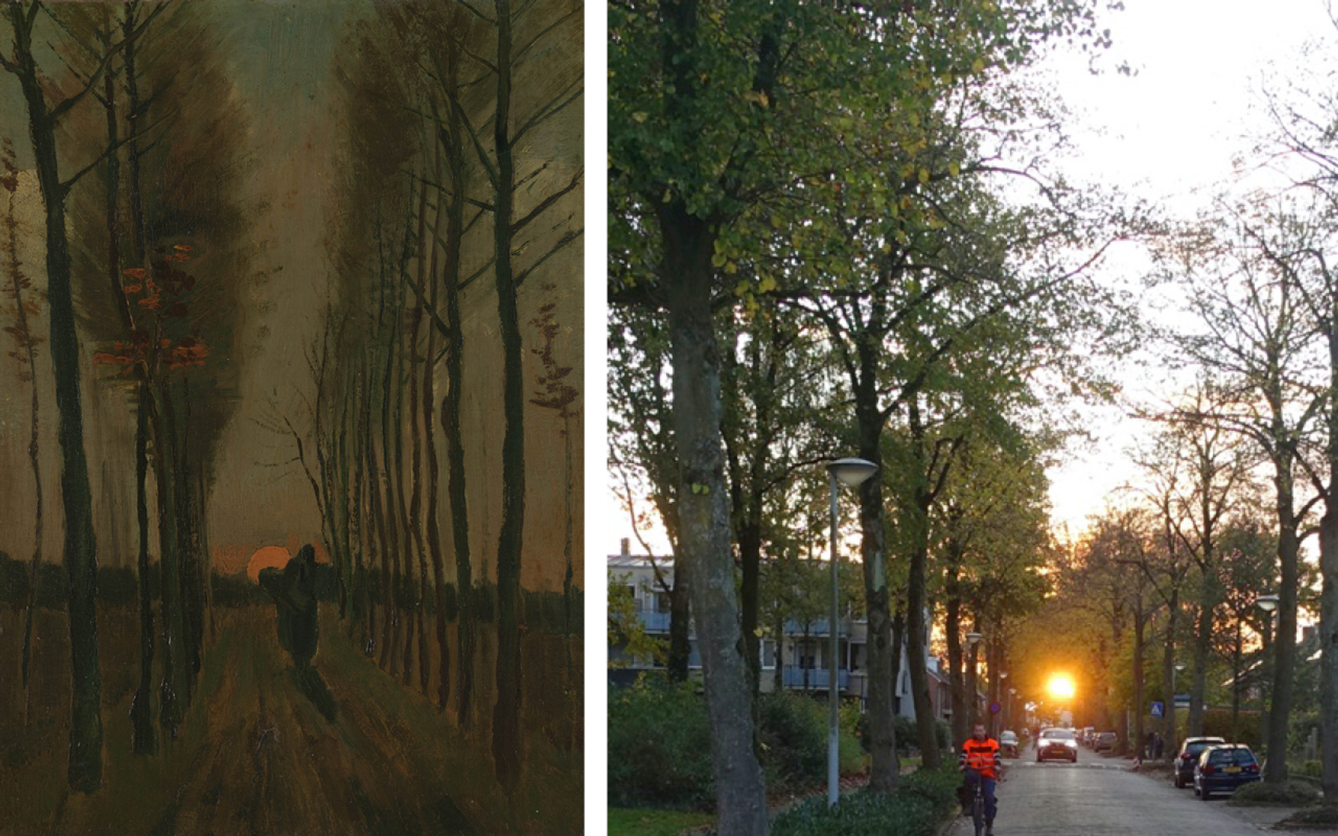 Van Gogh’s Lane of Poplars at Sunset (October-November 1884) and a photograph of Nuenen’s Weverstraat with a sunset