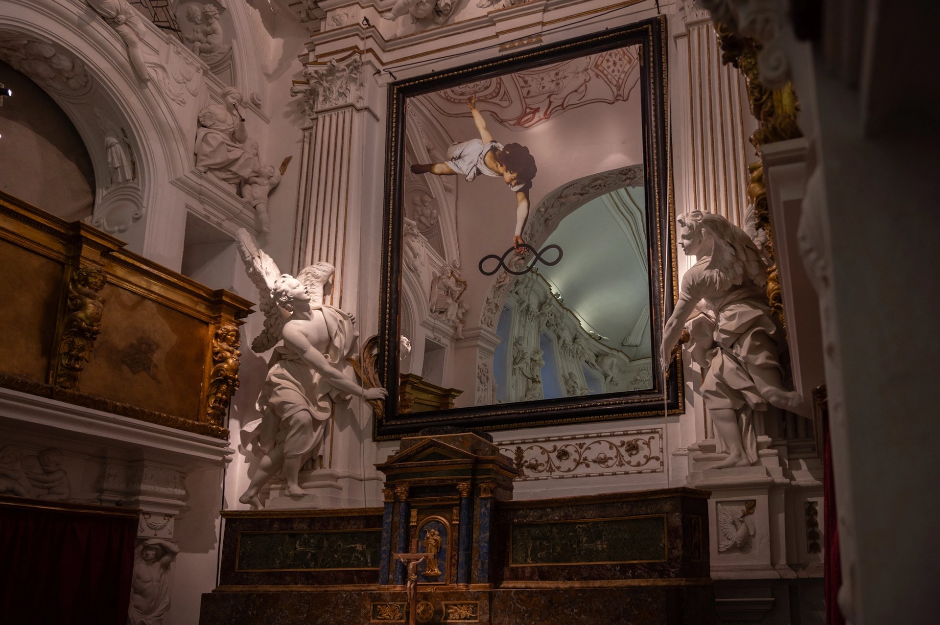 Pistoletto’s work in the oratory, a signature mirror piece, shows the angel depicted in the original Caravaggio painting; in the new version however, angel’s scroll has been replaced by the symbol of the Third Paradise which comes from the sign of mathematical infinity. The mirror creates an image within an image by reflecting the depiction of The Martyrdom of Saint Lawrence on the opposite wall of the oratory by Giacomo Serpotta.