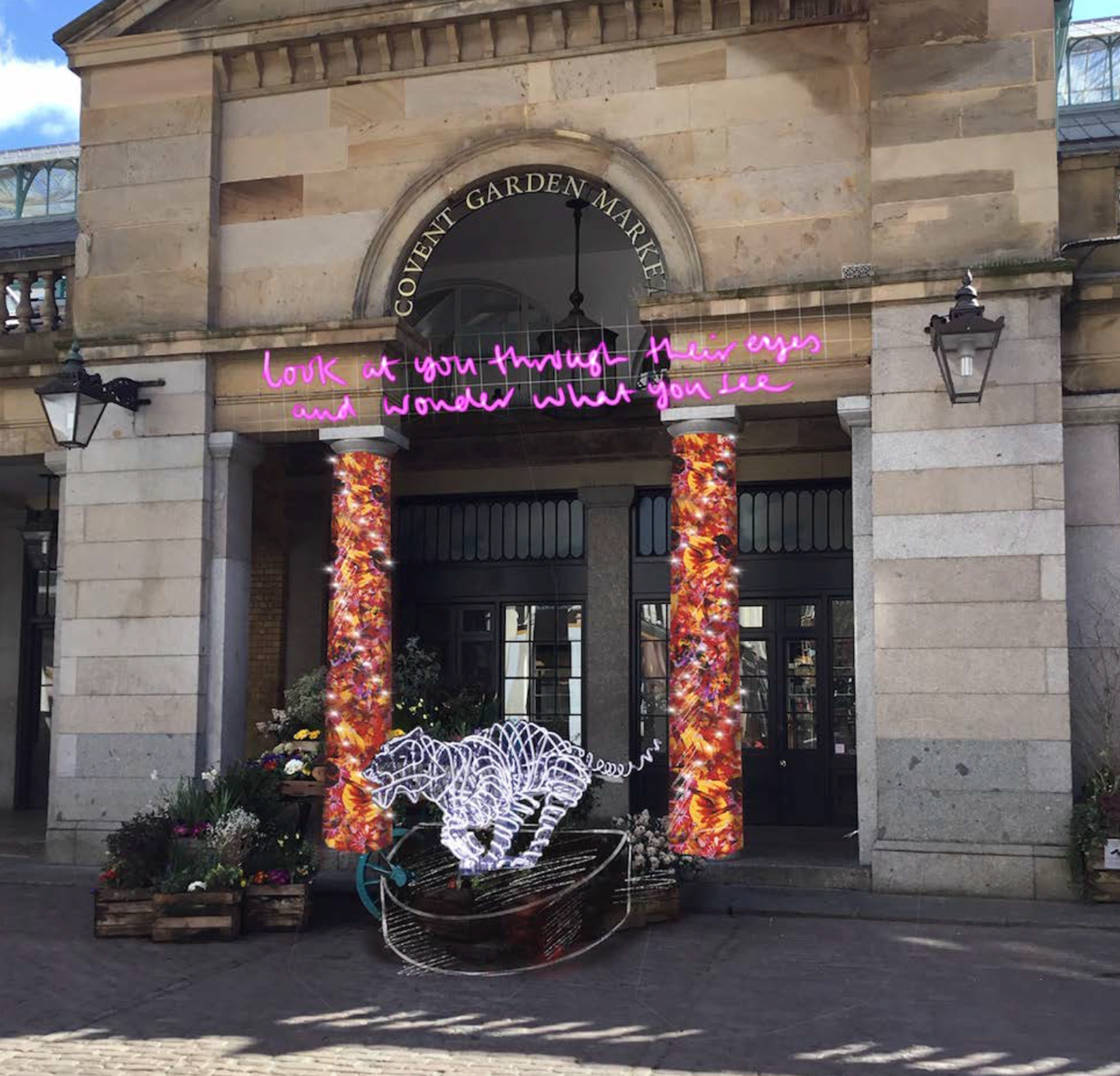 Now with more freedom of movement—for the time being at least—Burman has worked her maximalist magic on Covent Garden, the complex of shops and restaurants occupying London’s historic former fruit and veg market halls in the heart of the capital’s West End. And it’s an equally uplifting experience. Inside and out, on pillars, porticos and facades, are a plethora of illuminated beasts, together with uplifting slogans and densely collaged vinyl signs. In this glorious parallel universe, bindis, flowers, packaging, i-Pad drawings and a pantheon of Hindu goddesses and warrior queens coalesce and co-exist. Burman’s most ambitious installation yet, this Covent Garden extravaganza will remain in-situ until the end of October.