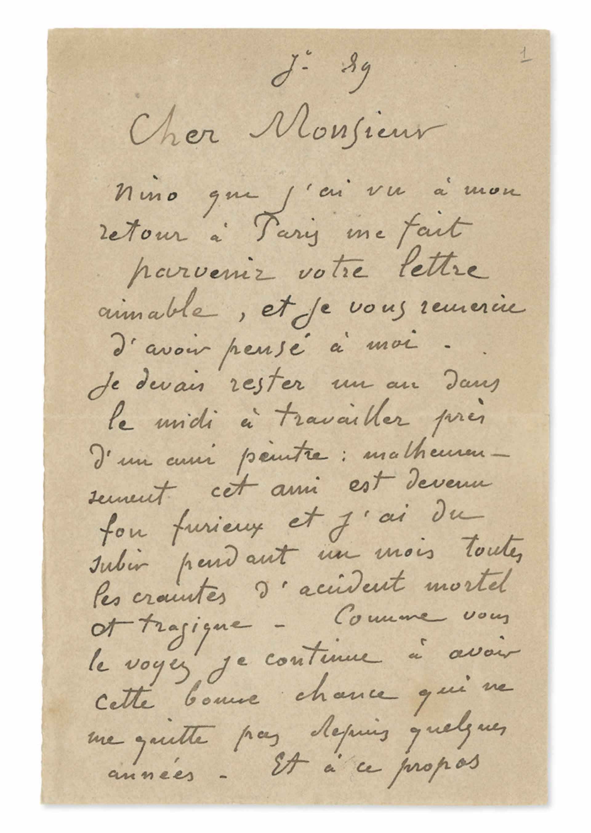 The recipient of the 1889 letter is not named, since it merely begins “Cher Monsieur”. Based on earlier research by the French scholar Victor Merlhès, the letter was almost certainly sent to Albert Dauprat (1857-1921), a wealthy sociologist who had bought two of Gauguin’s ceramic sculptures. Dauprat was also a good friend of Charles Laval, Gauguin’s companion on their 1887 trip to Panama and Martinique.