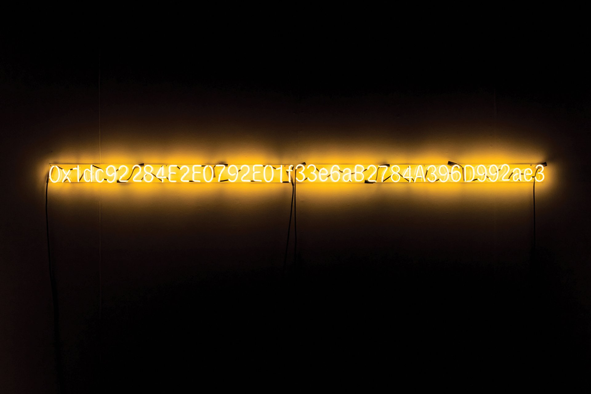 Abosch recently sold another digitally inspired work, Yellow Lambo (2018)—a neon sculpture of a blockchain address for a Lamborghini—for $400,000: more than the price of the actual car Yellow Lambo: courtesy of the artist