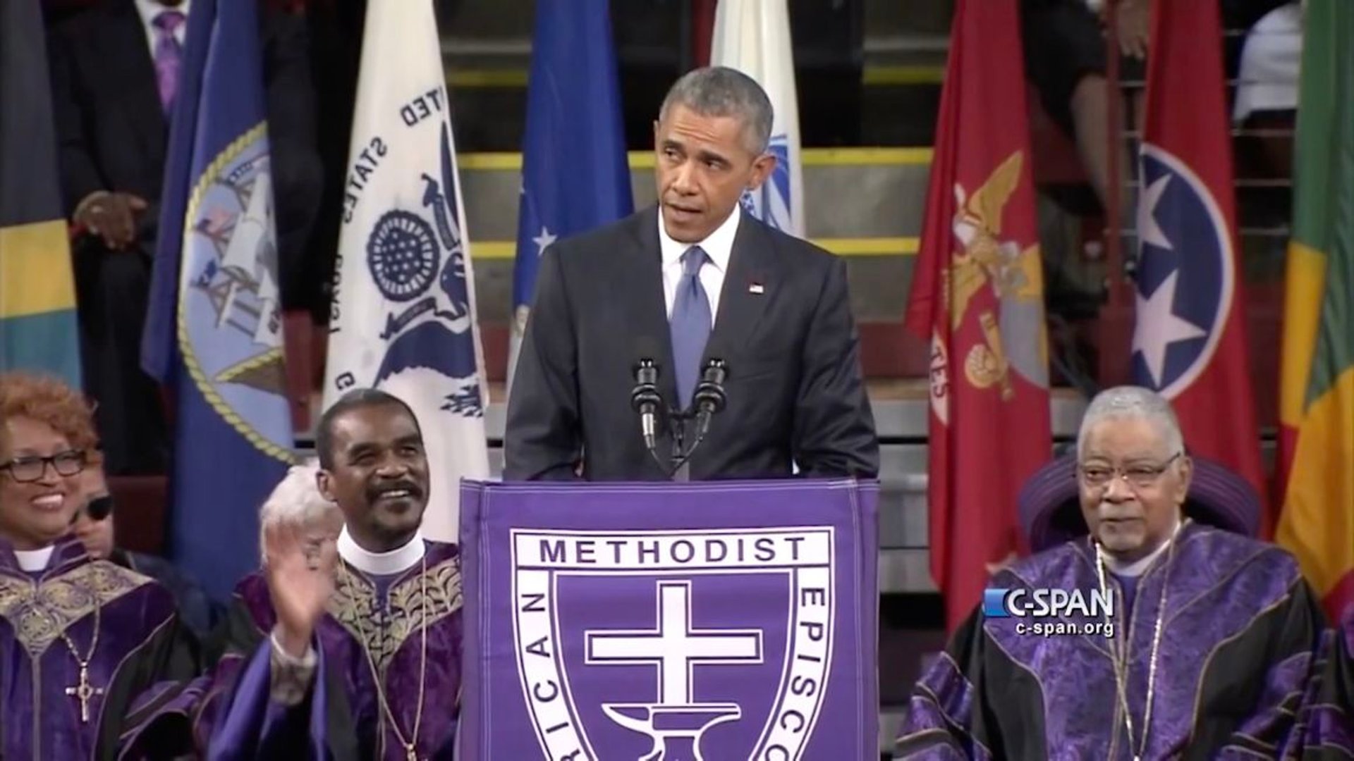 A still from Jafa's Love Is The Message, The Message Is Death (2016) showing President Obama singing Amazing Grace at the funeral for South Carolina state senator Clementa Pinckney