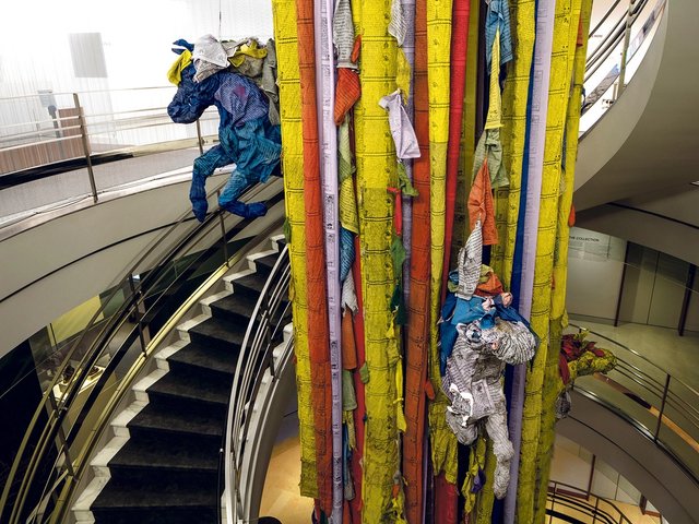 The exhibition, staged in the historic South Street Seaport district, brings textile works to an 18th-century warehouse