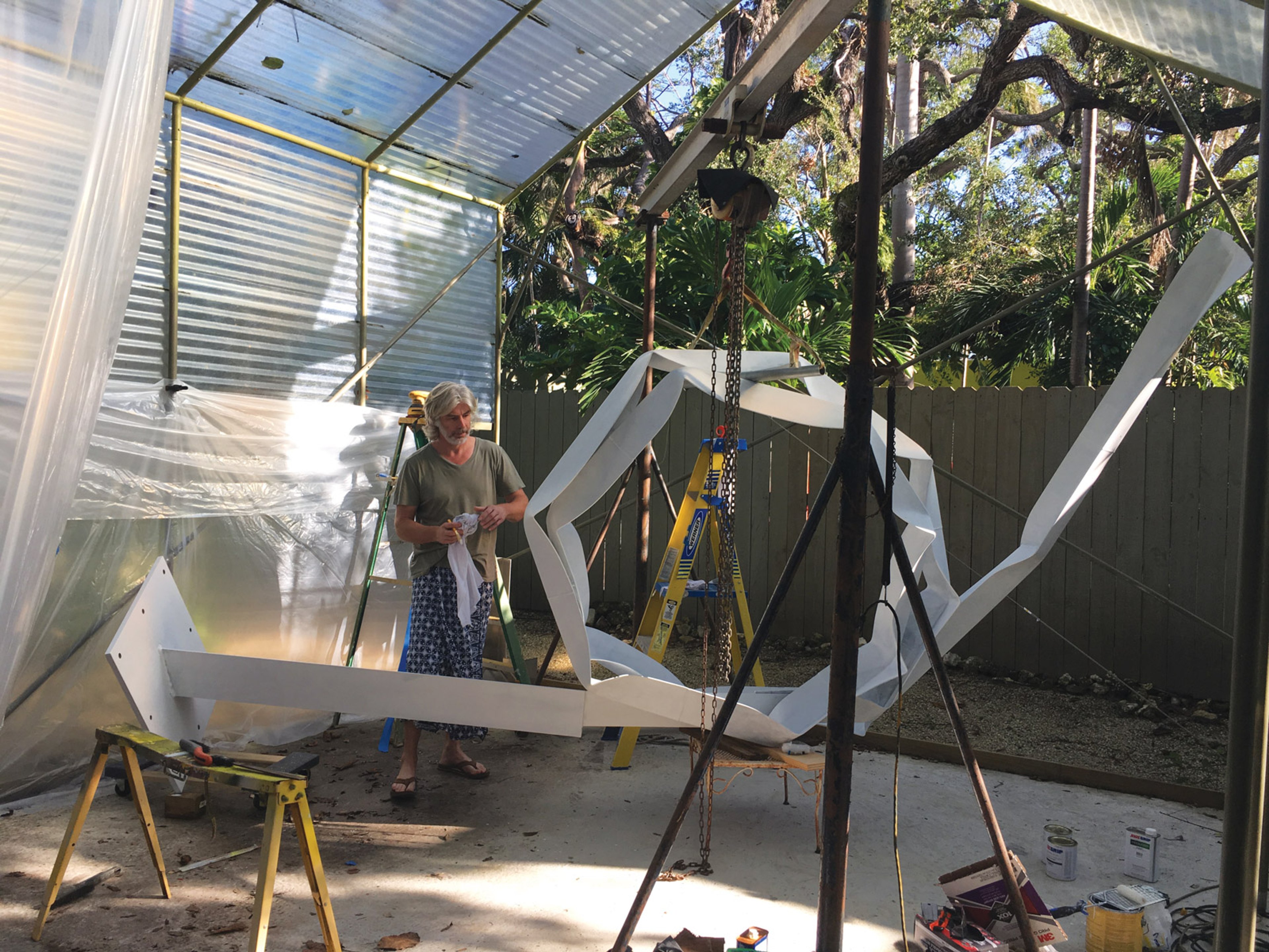 Mark Handforth: “My studio spreads between a couple of buildings and throughout the garden of our compound in Coconut Grove. I tend to work outdoors most of the time … I often use the tree limbs as rigging points for the larger sculptures… Having a tiny chunk of jungle in the middle of the city is quite a privilege.” Dara Friedman