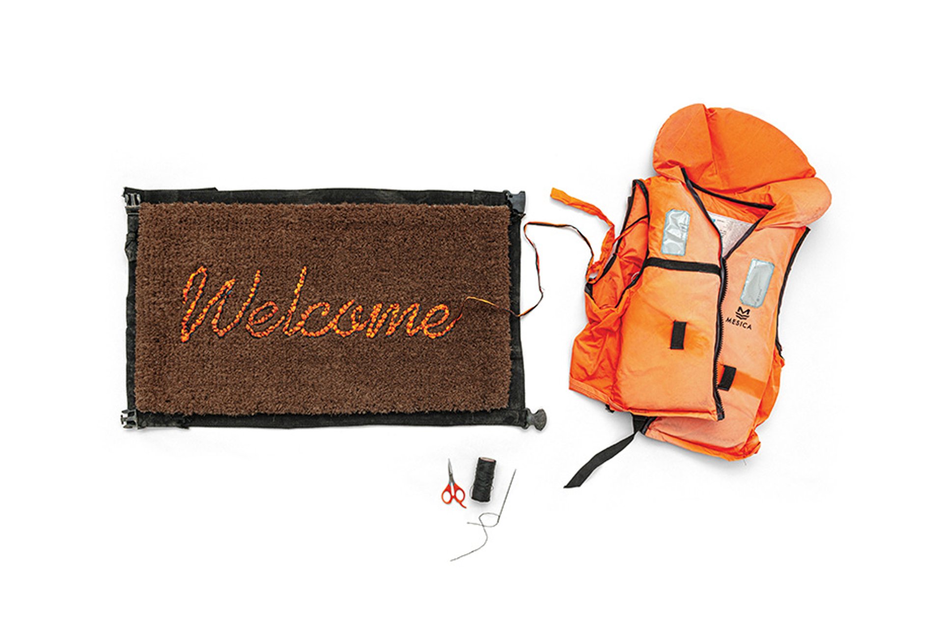 The welcome mats have been hand-stitched by women in detainment camps in Greece Image courtesy of Banksy