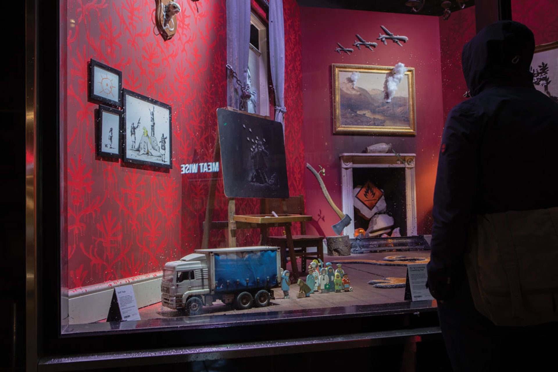 The homeware store, called Gross Domestic Product—essentially a window display that will never actually open—is selling a range of items, including the stab vest worn by the grime artist Stormzy at Glastonbury, welcome mats hand-stitched by women in detainment camps in Greece and disco balls made from police riot helmets. The objects have all been installed in a series of window displays along with often-reproduced paintings such as Banksy’s Flower Thrower.