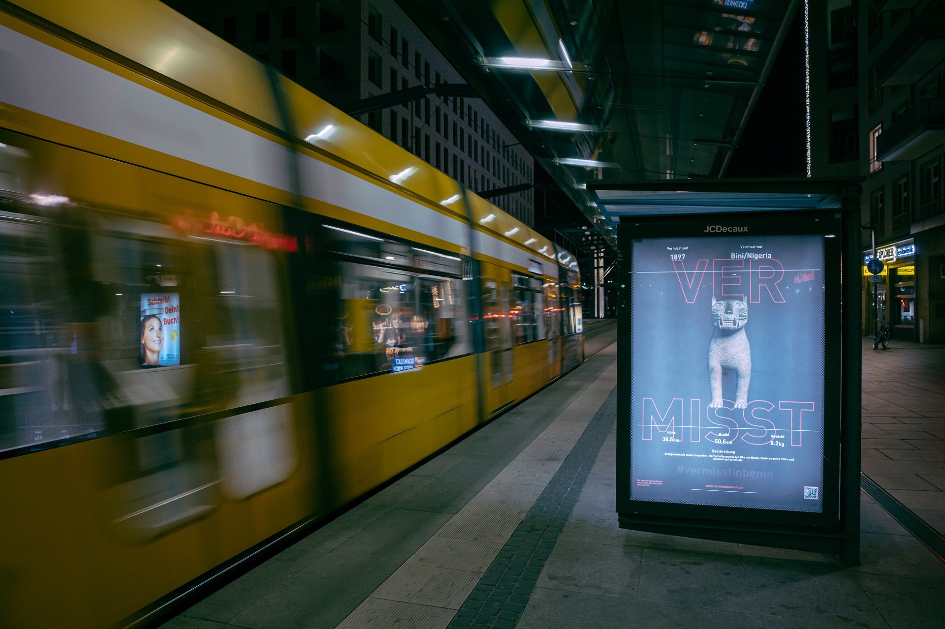 His posters, on public display in Dresden and towns nearby, show images of Benin bronzes in Dresden’s Museum für Völkerkunde with the text “Missing in Benin.” Ogboh was commissioned to create the posters by the museum, which possesses five Benin bronzes bought in London between 1899 and 1904.