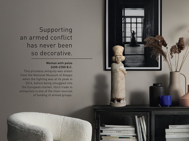 Similarly, another ad in the series with the headline “Supporting an armed conflict has never been so decorative” depicted a funerary monument that the Met says is thought to be from the city of Palmyra in Syria and created during the first three centuries AD, placed on a bookcase next to some tasteful vases and a fuzzy armchair. “This priceless antiquity was stolen in the National Museum of Palmyra by Islamic State militants during their occupation of the city, before being smuggled into the European market,” the ad read. “The trade in antiquities is one of the terror group’s main sources of funding.”