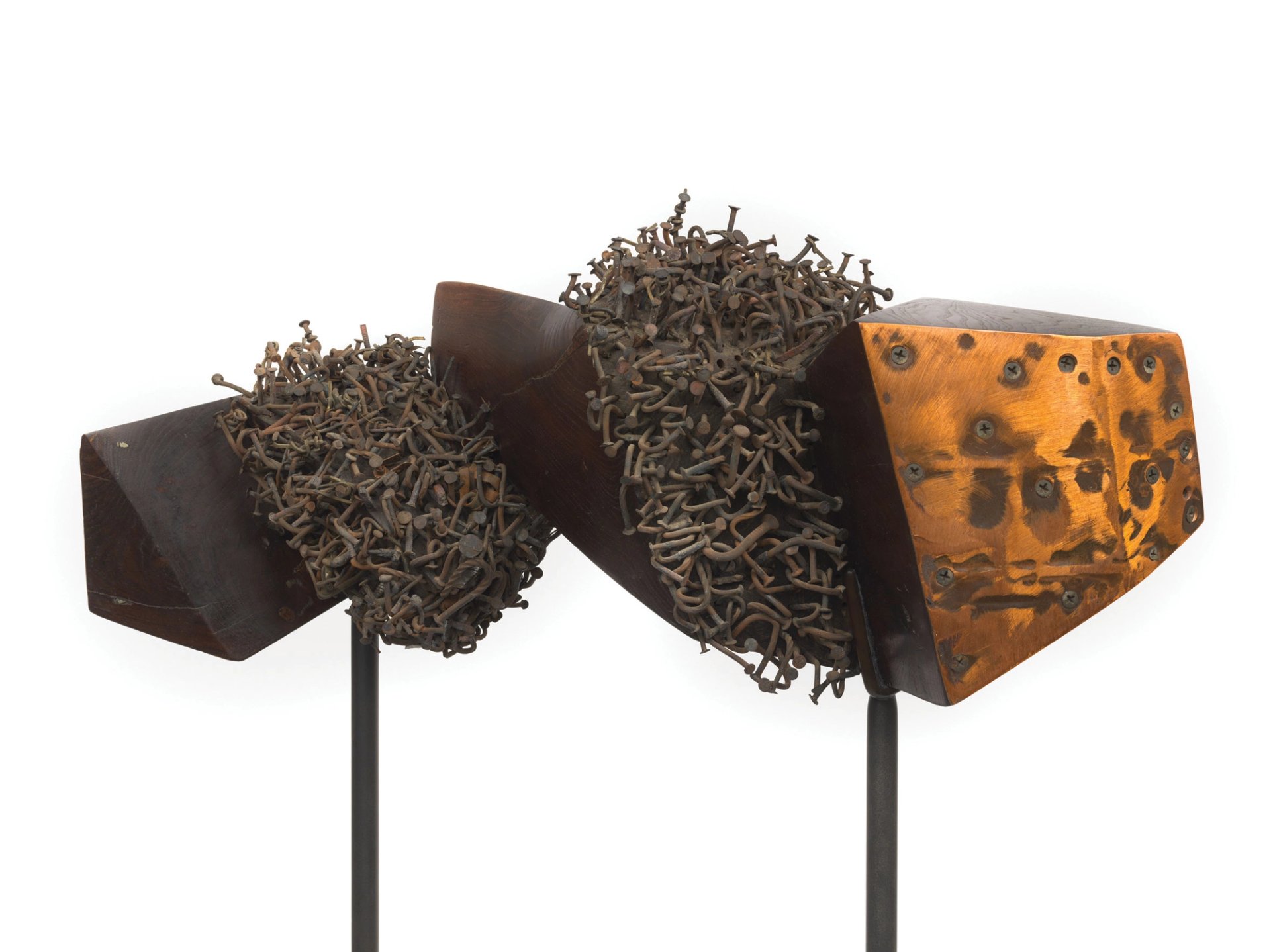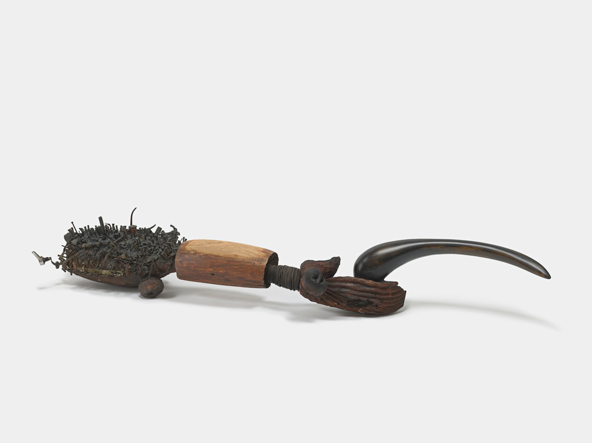 The final room of the show contains large paintings that memorialise figures from the poet Maya Angelou to the boxer Muhammad Ali. Whitten, who was born in Alabama in 1939, met Martin Luther King Jr and lived through the Civil Rights Movement. He also created the sculpture Homage to Malcolm (1965) from a single piece of elm about half a year after the activist was assassinated. Here, the catalogue notes, Whitten first used three elements that would become a trademark: embedded nails, painted horns and an asymmetric, decentralised composition. As well as remembering the slain Civil Rights leader, the work alludes to the protective aspects of Central African religious sculpture, the catalogue adds.