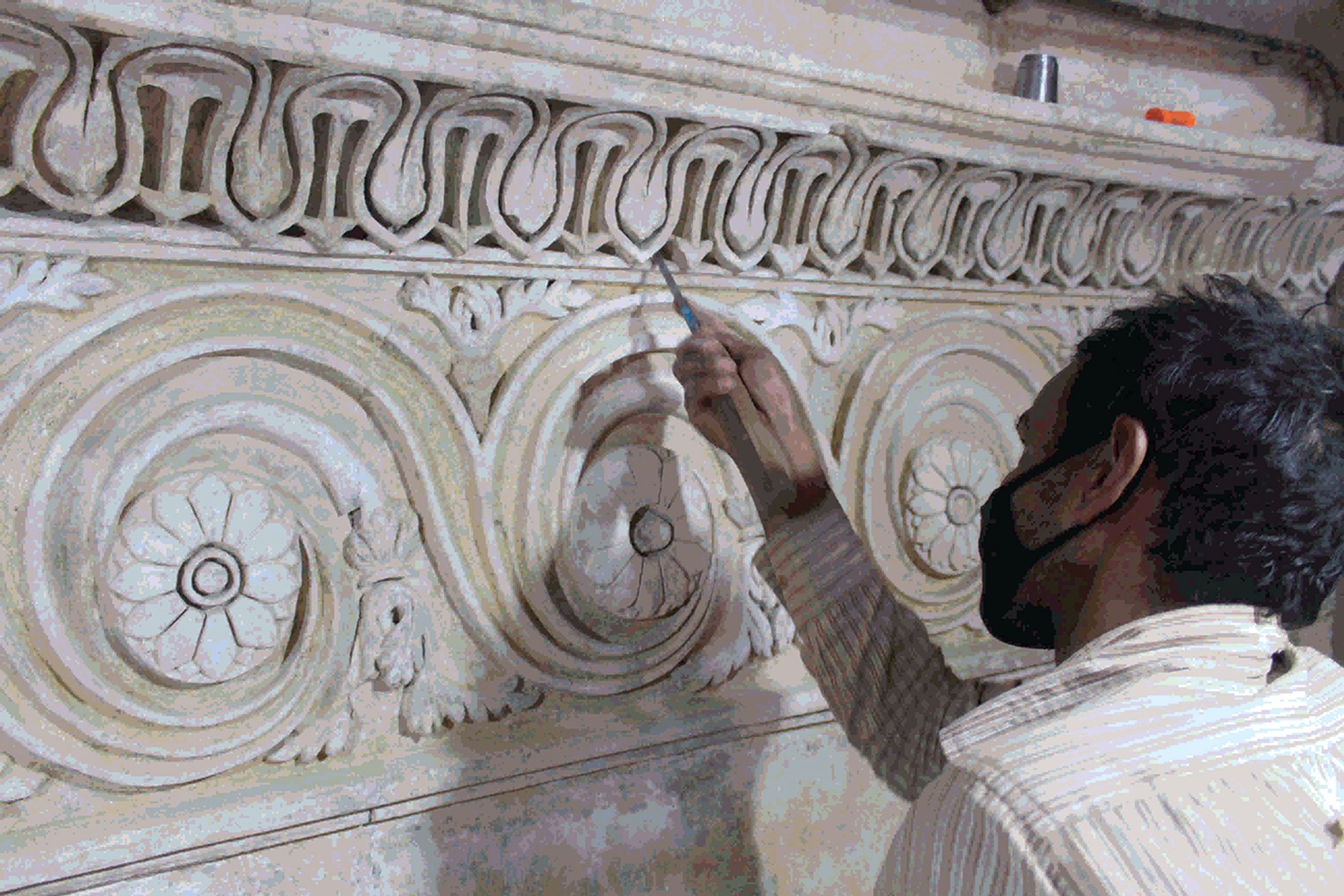 A conservation technician working at the Osmania Women’s College in Hyderabad, India World Monuments Fund
